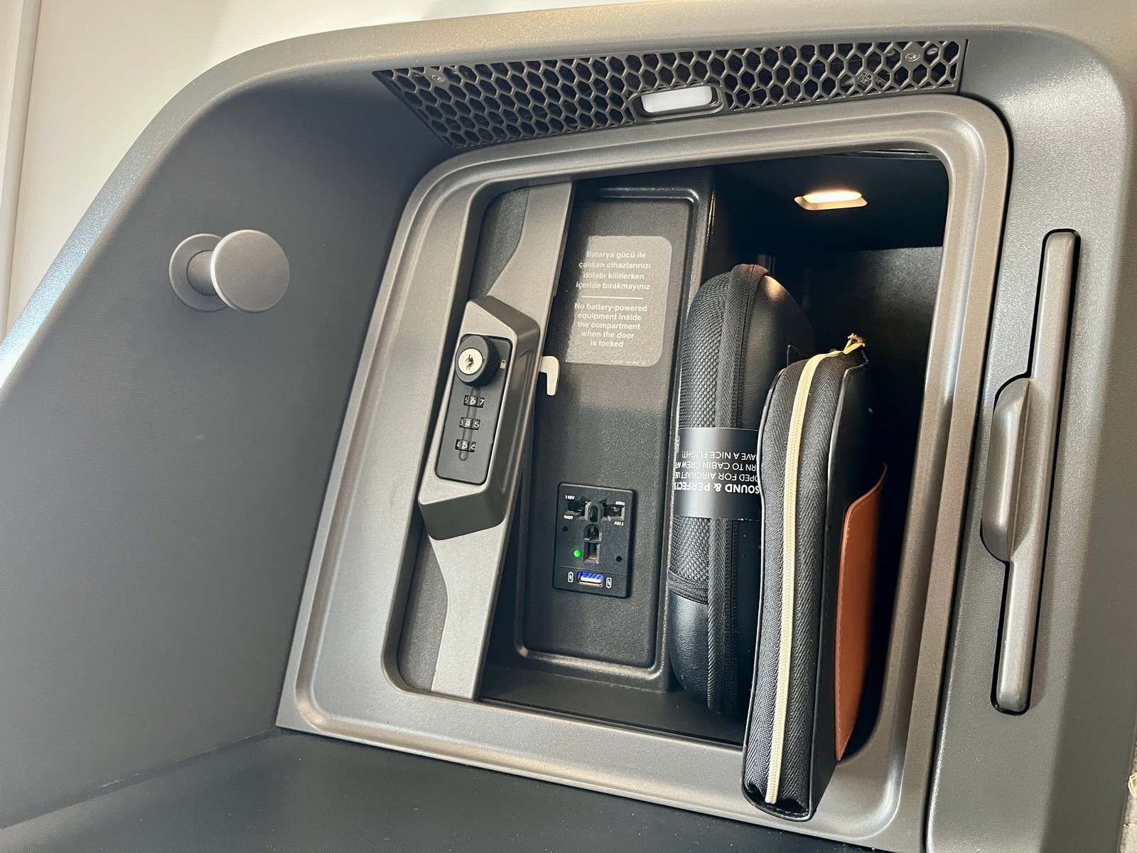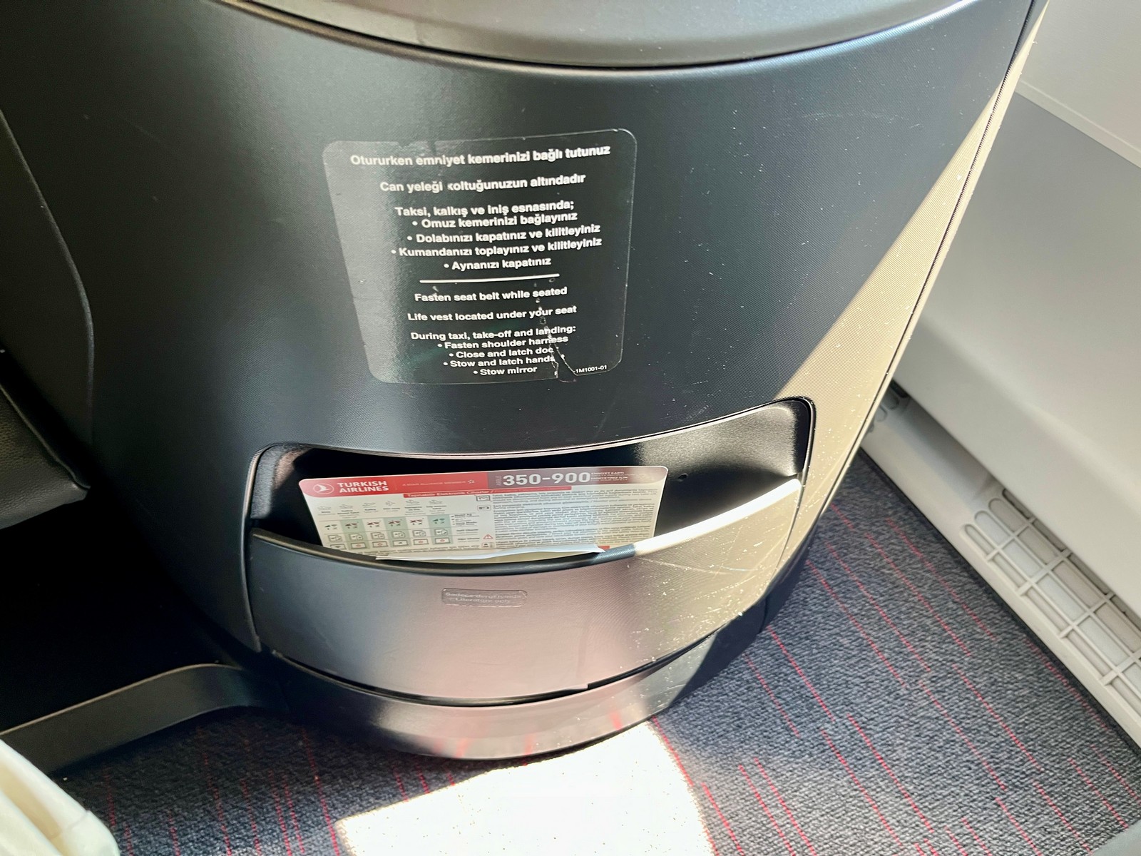 Die Turkish Airlines A350 Teilflotte weist laut Planespotters ein Durchschnittsalter von nur 2,3 Jahren auf. Das junge Alter ist dem Flugzeuginneren deutlich anzusehen. Die Kabine wirkte größtenteils neuwertig und makellos. Sie wirkte zudem sehr hell und einladend. Dank kleinerer Overhead-Bins über den Mittelsitzen ergab sich ein angenehmes Raumgefühl. Farblich dominierten Grau-, Beige- und Schwarztöne. Die Turkish Airlines Markenfarbe Rot fand man dagegen nur in Form von Akzenten in der Crew-Uniform.