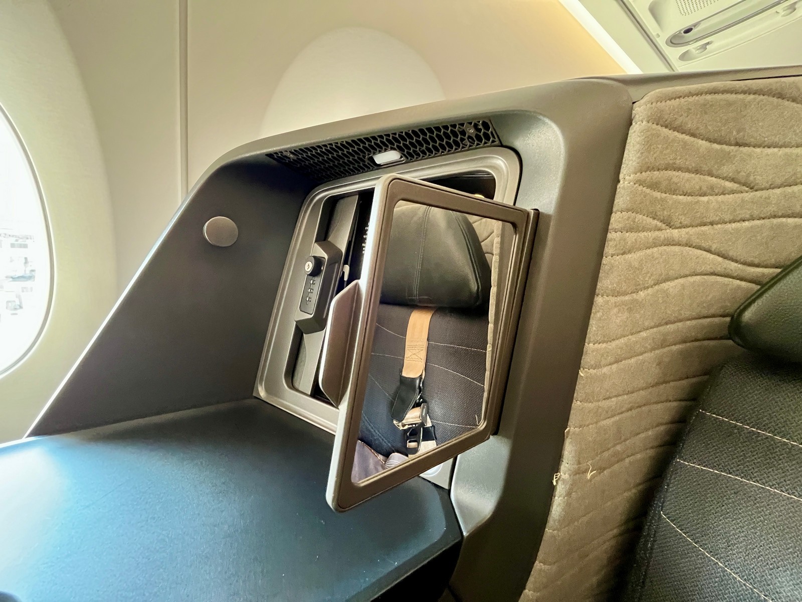 Jeder der 32 Business Class Sitze im Turkish Airlines Airbus A350 ist gerade nach vorne ausgerichtet und verfügt über eine seitlich angeordnete Ablagefläche samt Staufach. Die markante Sitzverschalung sorgt für ein gutes Maß an Privatsphäre – auch ohne Tür. Leider werden an den Fensterplätzen die gleichen Sitze wie in der Mitte verwendet, was dazu führt, dass Passagiere nicht nur vom Sitznachbar, sondern auch vom eigenen Fenster abgeschirmt werden. Wer gerne aus dem Fenster schaut, sollte daher einen zum Gang ausgerichteten Fenstersitz wählen.