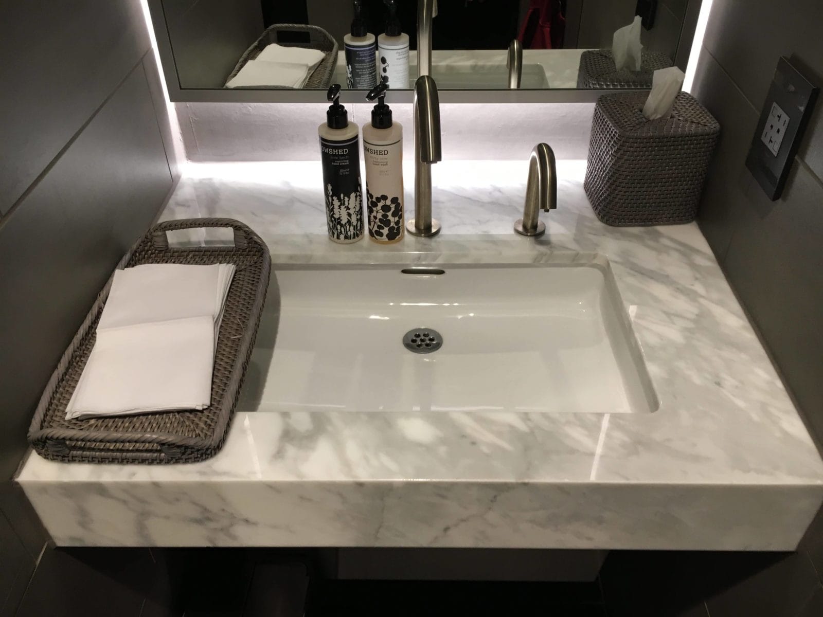 Alles in allem gefällt mir das Design hier sehr gut. Der weiße Marmor in Kombination mit den dunklen Akzenten in Form von Sitzmöglichkeiten, Tischen und Wänden sieht sehr hochwertig aus und macht sich überaus gut in der Lounge. Und auch die Aufteilung der Lounge in ihre verschiedenen Bereiche wirkt durchdacht und sinnvoll gestaltet.