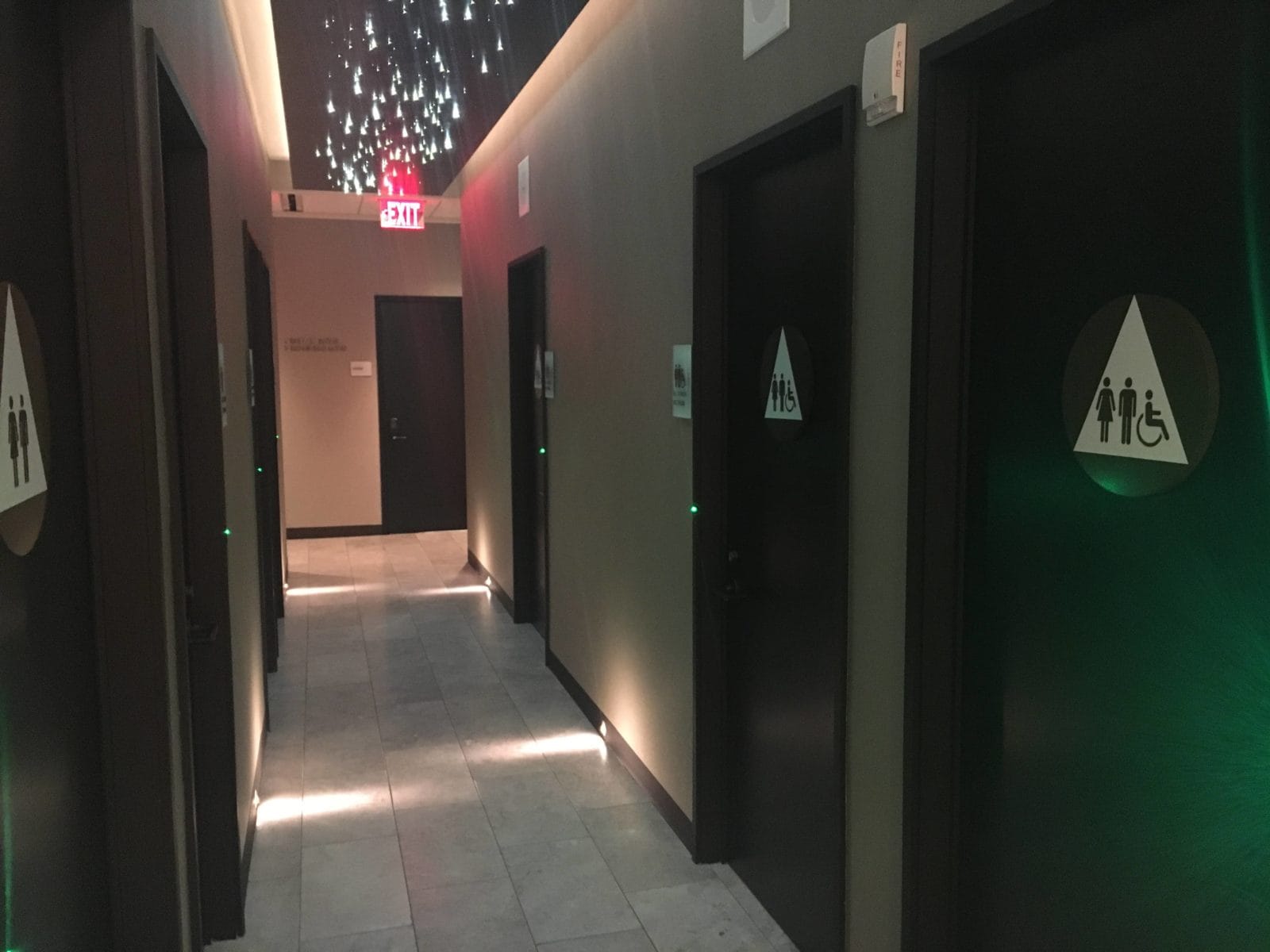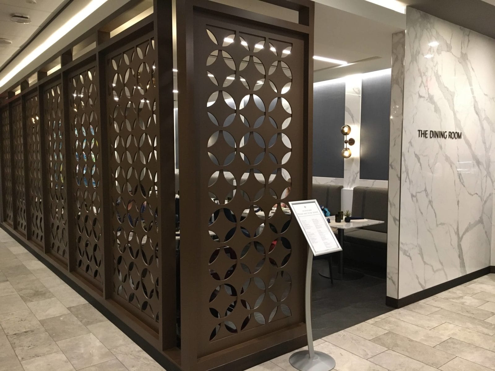 Auf der anderen Seite dieses Zylinders, also nach dem Weinregal bzw. dem Buffet, geht es linkerhand zu den WCs, welche allesamt separate Räume darstellen und Unisex sind; geradeaus geht es zur Anmeldung für die Duschen bzw. den Ruheräumen, und rechterhand befindet sich der Dining Room, ein bedientes Restaurant innerhalb der Lounge.