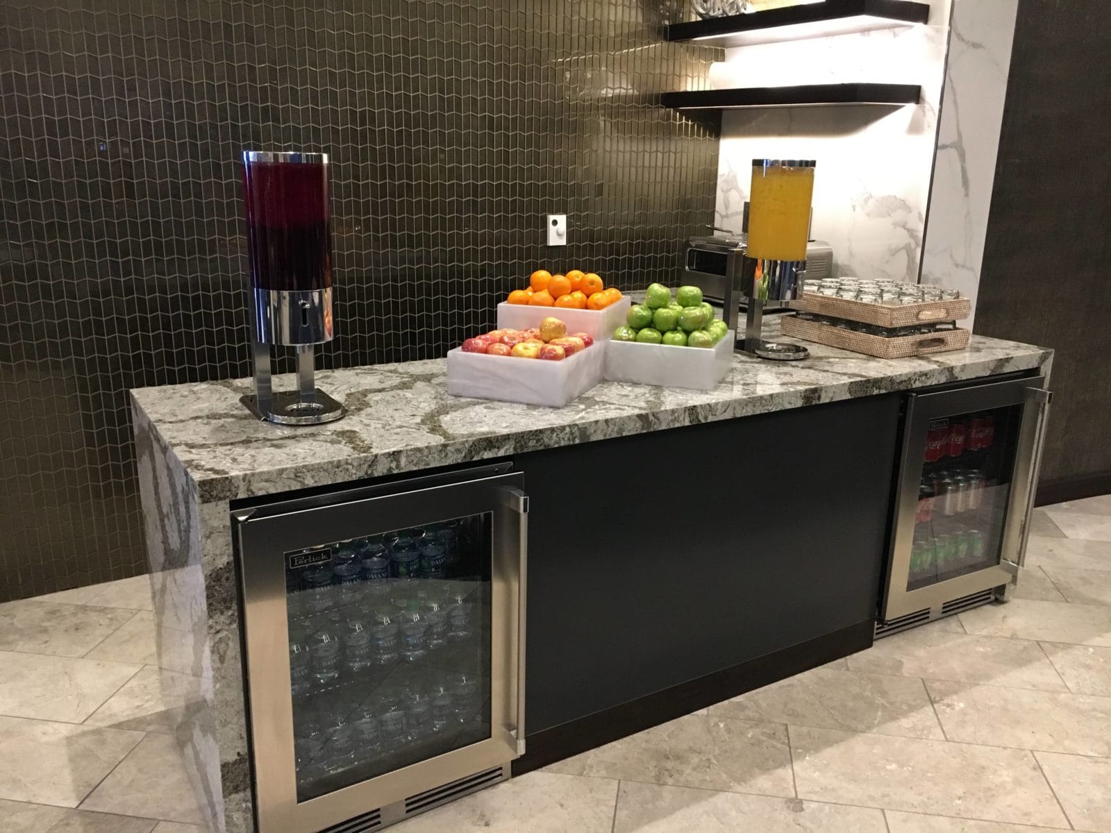 Mit der United Polaris Lounge wird das Essen im Flieger eigentlich fast schon unnötig, denn was hier aufgetischt wurde, war mit Abstand das Beste, das ich je in einer Flughafen Lounge zu Essen hatte. Wir hatten, aus Salt Lake City kommend, einen etwa 12-stündigen Layover in Los Angeles eingebaut, und so konnten wir mit unserem Ticket für den Abend bereits nach der Landung in die Polaris Lounge. Mit uns waren nur eine Handvoll weiterer Passagiere hier, so dass wir alles in Ruhe anschauen konnten (perfekt für ein Review also). Da es auf dem 1,5-stündigen Flug nur etwas zu Trinken und einen Snack gab kam die Lounge gerade richtig. Kaum hatten wir uns gesetzt, kam ein Angestellter mit einem Tablett und bot uns einen Passionsfrucht-Drink mit Alkohol an.