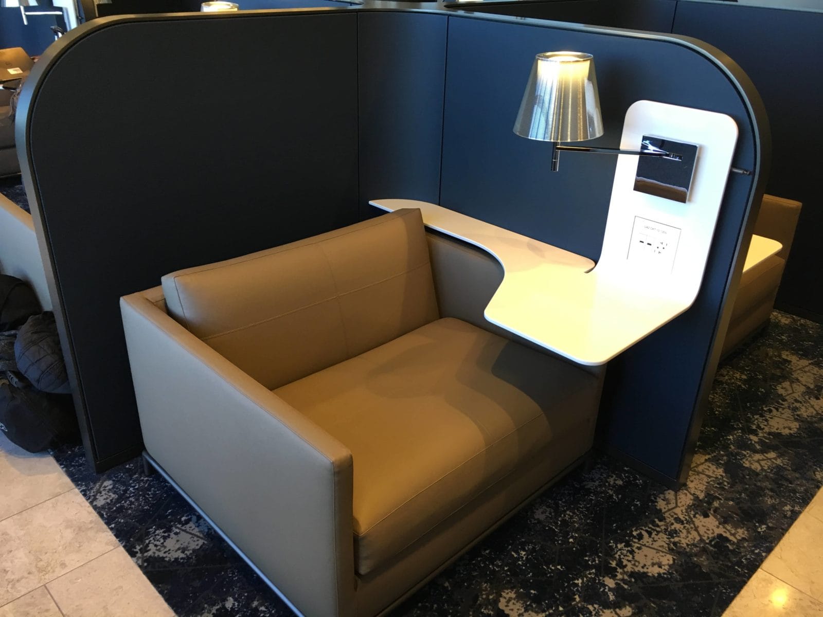 Im Inneren der Lounge, quasi zwischen Eingang und den Fensterplätzen, finden sich relativ private Kabinen, welche sich hervorragend zum Arbeiten eignen. Wer Steckdosen benötigt wird hier ebenfalls seine Freude haben, diese sind sowohl an den Arbeitsplätzen seitlich, als auch an den Fensterplätzen im Boden zu Genüge vorhanden.