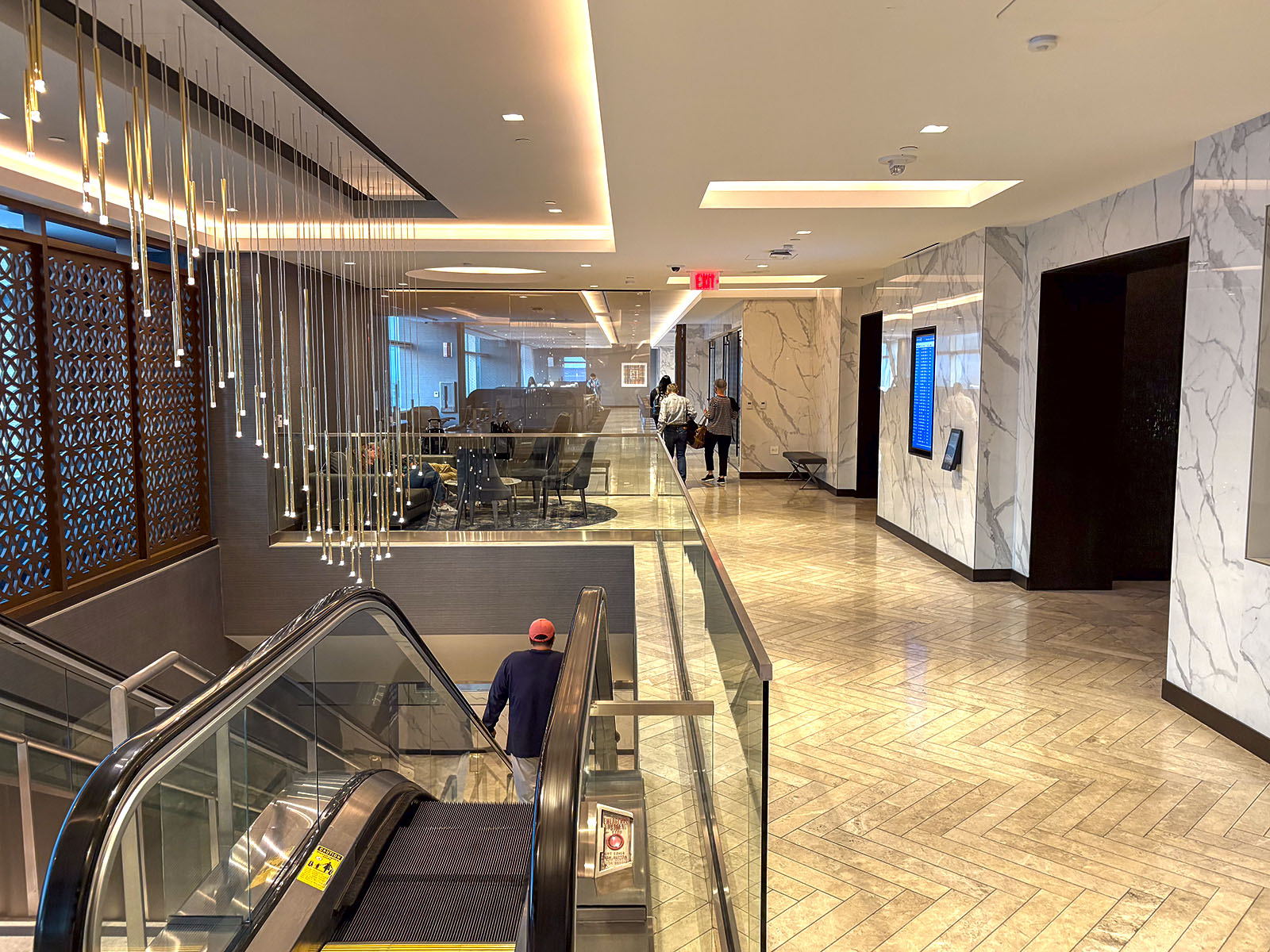 Nach der Dusche ging es für mich einmal quer durch die bereits sehr großzügige untere Etage zur Rolltreppe, die mich in die obere Etage brachte. Hier oben spielt sich das eigentliche Lounge-Geschehen ab – und dieser Bereich ist tatsächlich spürbar groß dimensioniert.