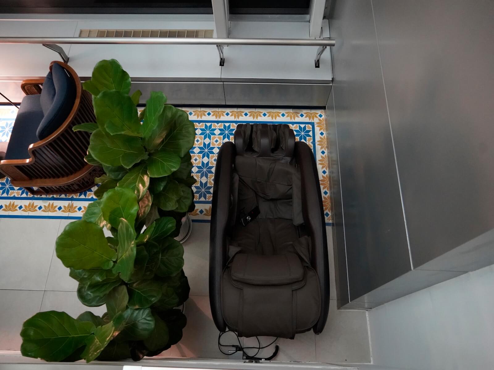 Die Toiletten befinden sich direkt hinter dem Empfangsbereich auf der linken Seite. Die Lounge bietet den Gästen auch eine Dusche. Vom Empfangsbereich nach rechts abgebogen und hinten rechts, hinter Blumen versteckt, gibt es einen großen Massagesessel. Schön fand ich auch den Fußboden gestaltet, mit den kleinen Fliesen der Lotusblume.