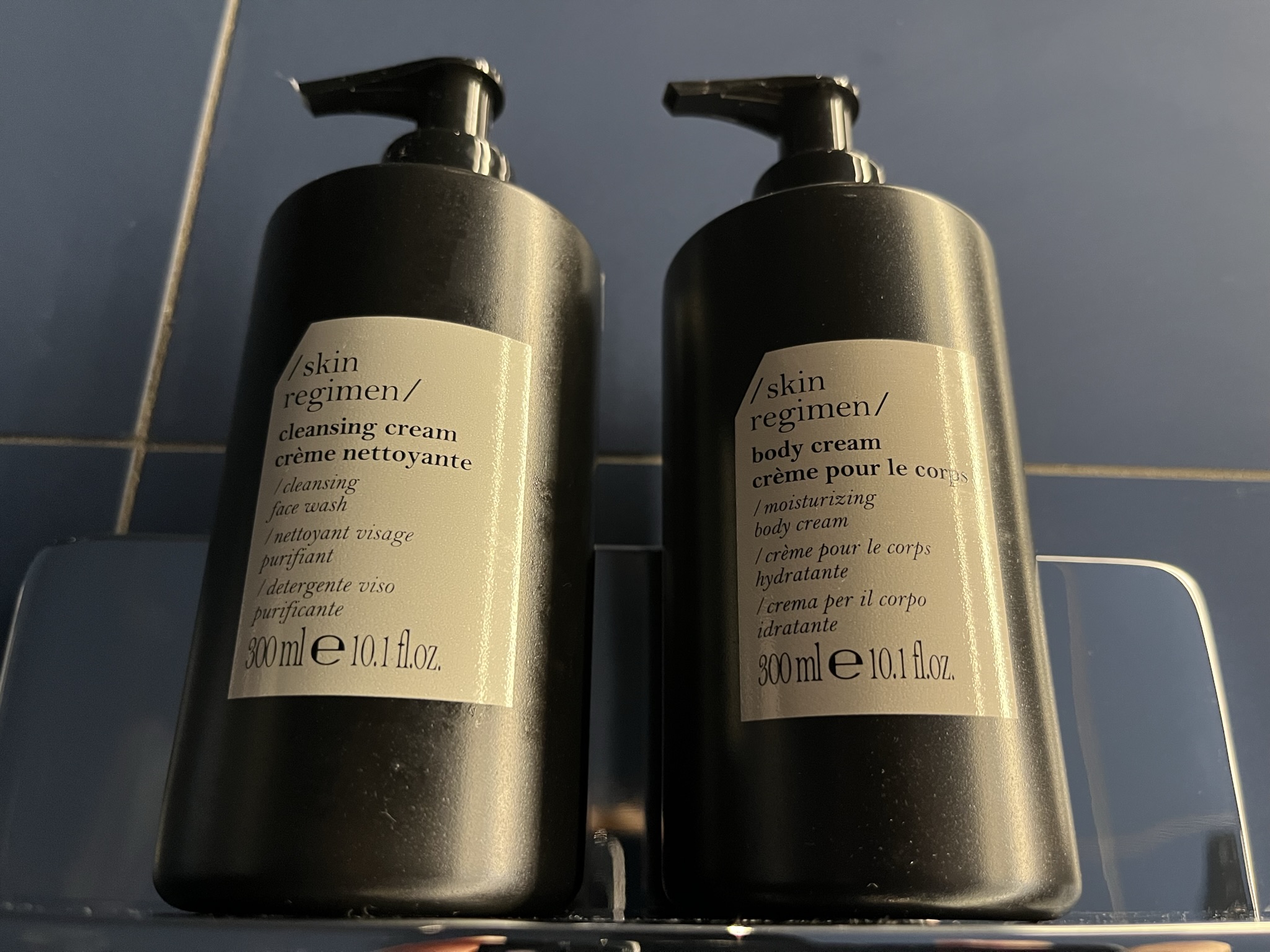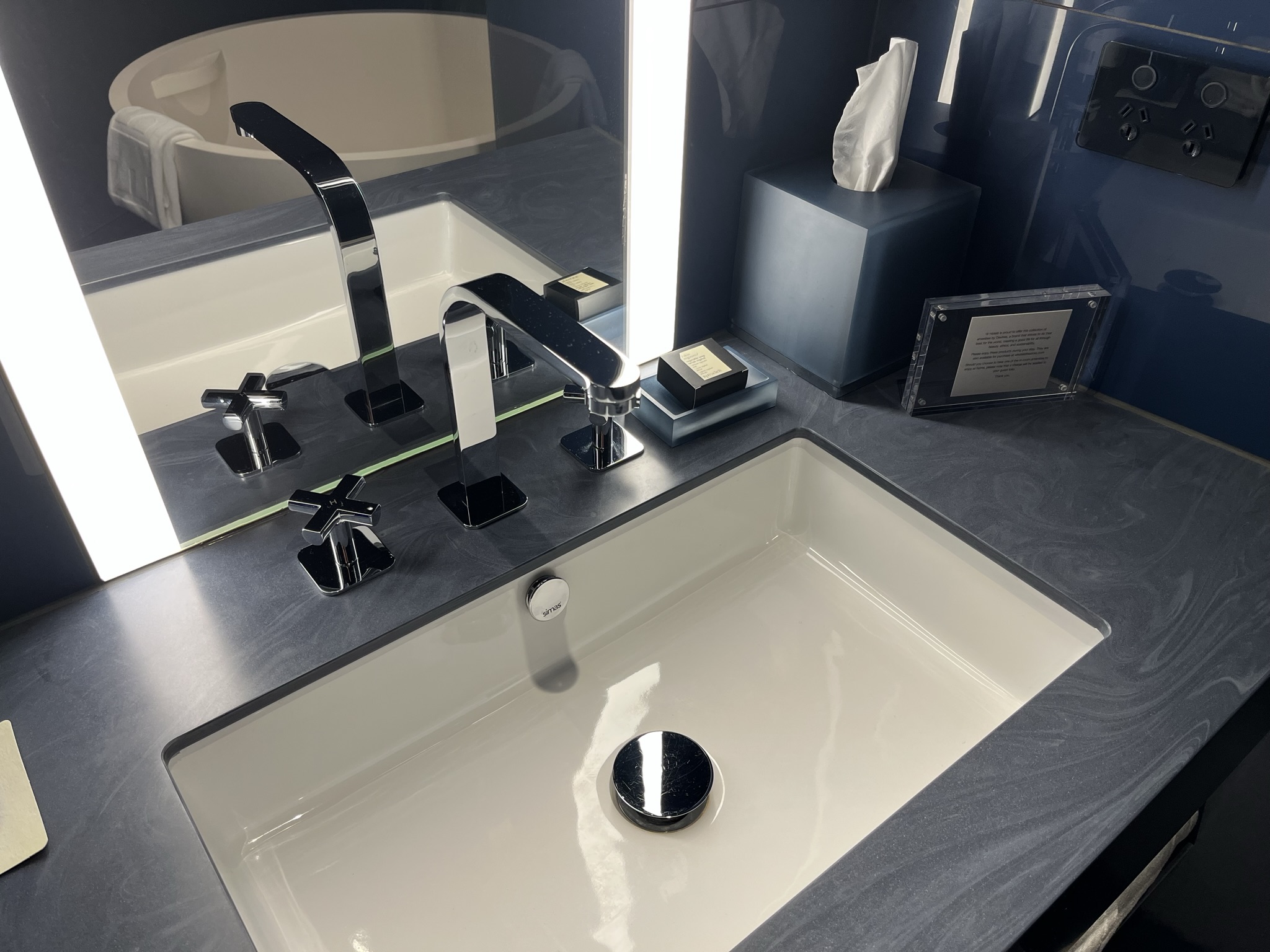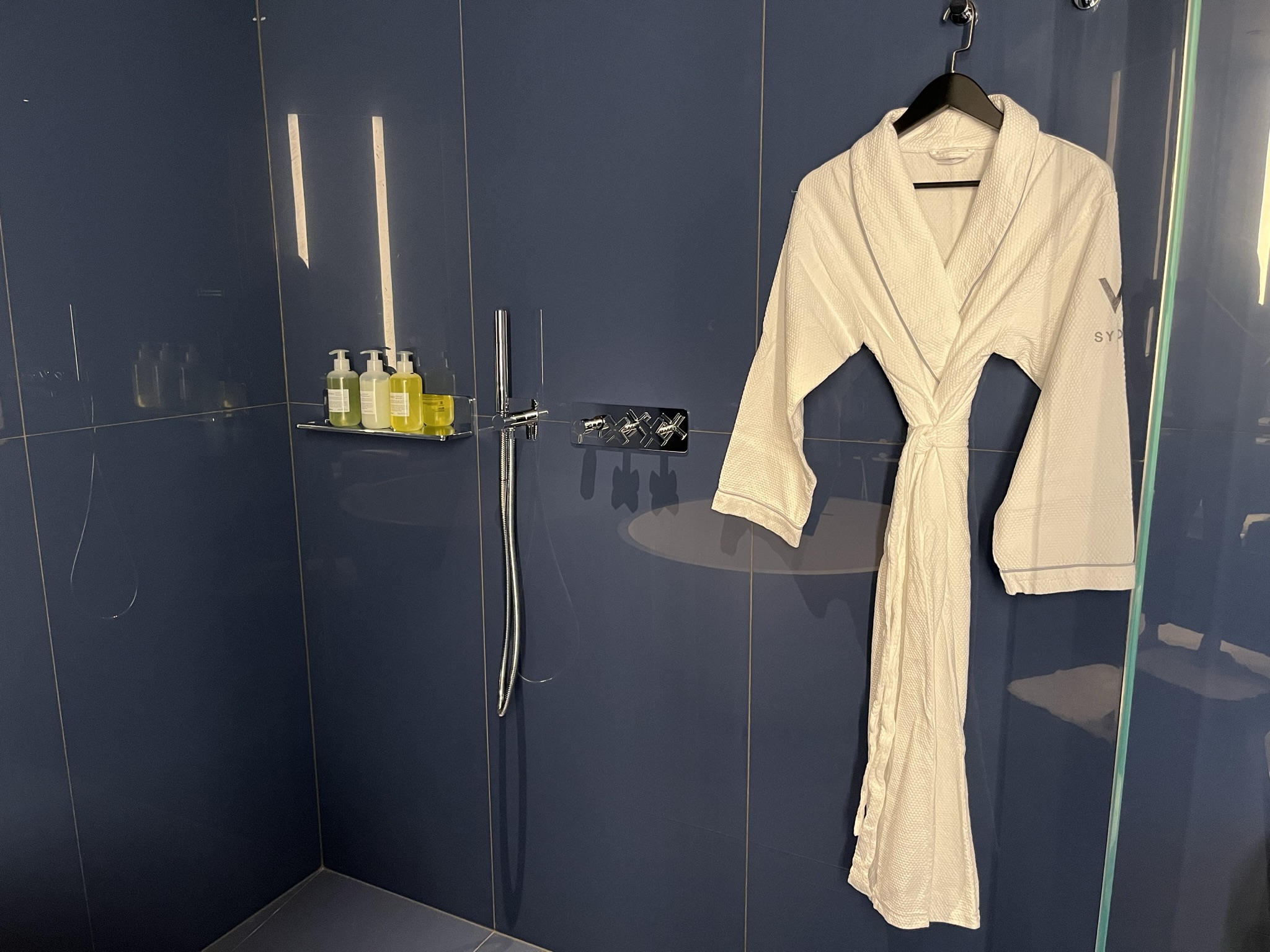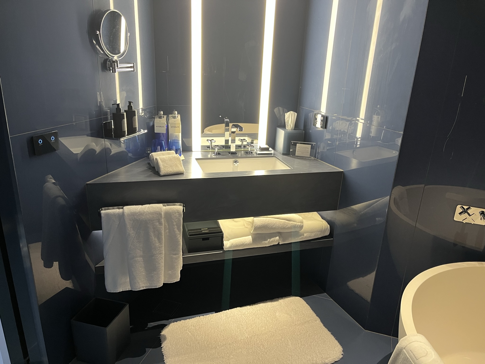 Das komplett in Blautönen gehaltene Bad verfügte neben Waschbecken, Toilette und Dusche über eine kreisrunde Badewanne. Was mir nicht gefiel waren die getrennten Wasserhähne für kaltes und warmes Wasser, da es mit diesen immer etwas länger dauert bis man die passende Temperatur “gemischt” hat.