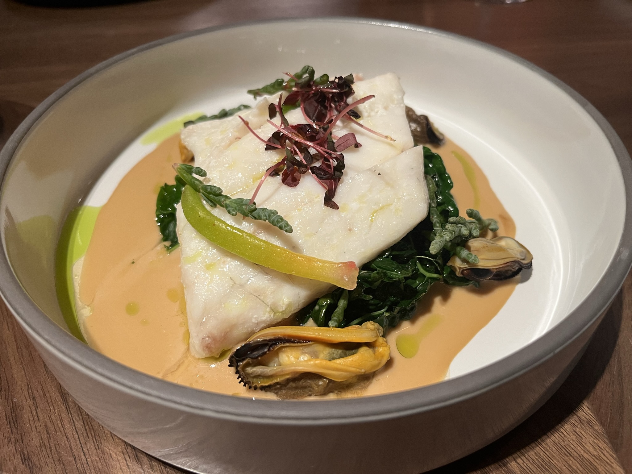 - Poached Aquna Murray Cod, Pickled Jervis Bay Mussels, Sauteed Cavolo Nero, Smoked Dashi Butter, Sea Herbs 60 AUD