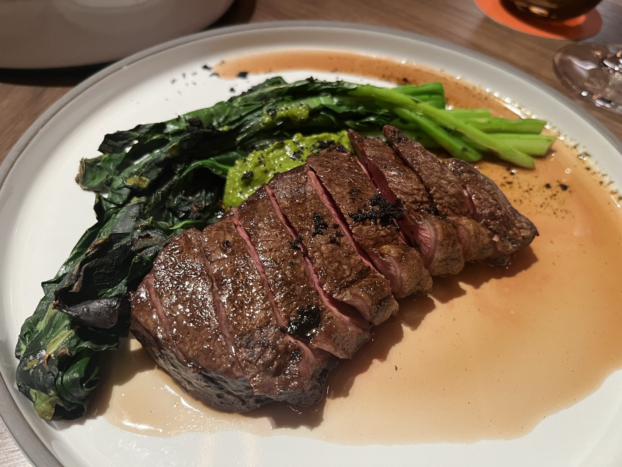 - Hunter Valley Shorthorn Rump Cap, Jalapeño Puree, Gai Lan, Mustard 75 AUD