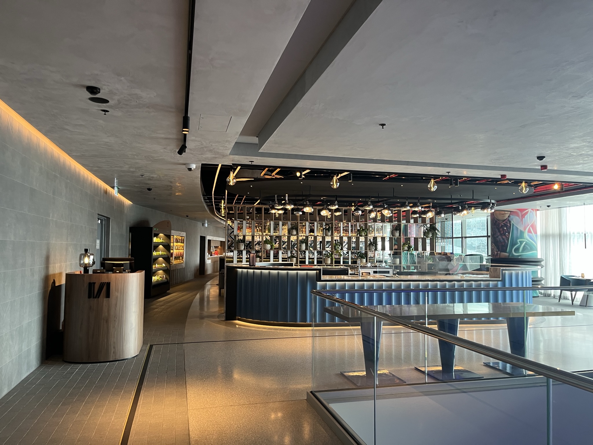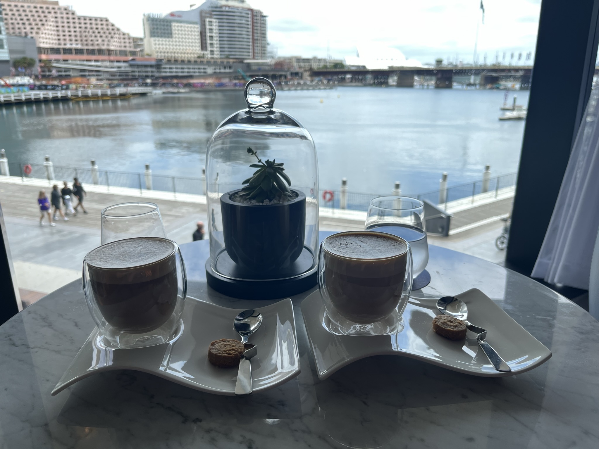 Auch am Check-In Desk wurden wir freundlich begrüßt. Da der Check-In Prozess etwas länger dauerte, bot uns der Mitarbeiter einen kostenlosen Drink in der Living Room Bar vor dem Check-In Bereich an. Da es ca. 13 Uhr mittags war, entschieden wir uns für einen Kaffee und beobachteten das Treiben am Darling Harbour während wir warteten.