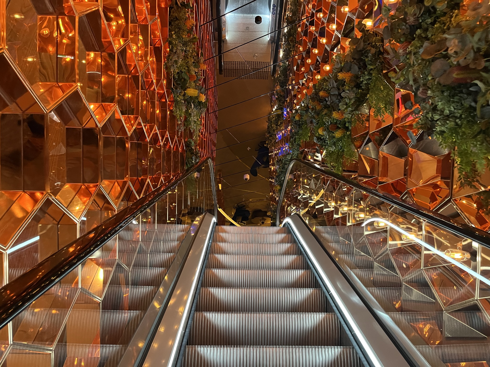 Wir fuhren mit dem Taxi vor und wurden von einer freundlichen Mitarbeiterin begrüßt, die uns anbot das Gepäck in Empfang zu nehmen. Wir liefen durch den im typischen W-Stil dekorierten und beleuchteten Eingangsbereich, nahmen die Rolltreppe eine Ebene nach oben und erreichten den eigentlichen Check-In Bereich.