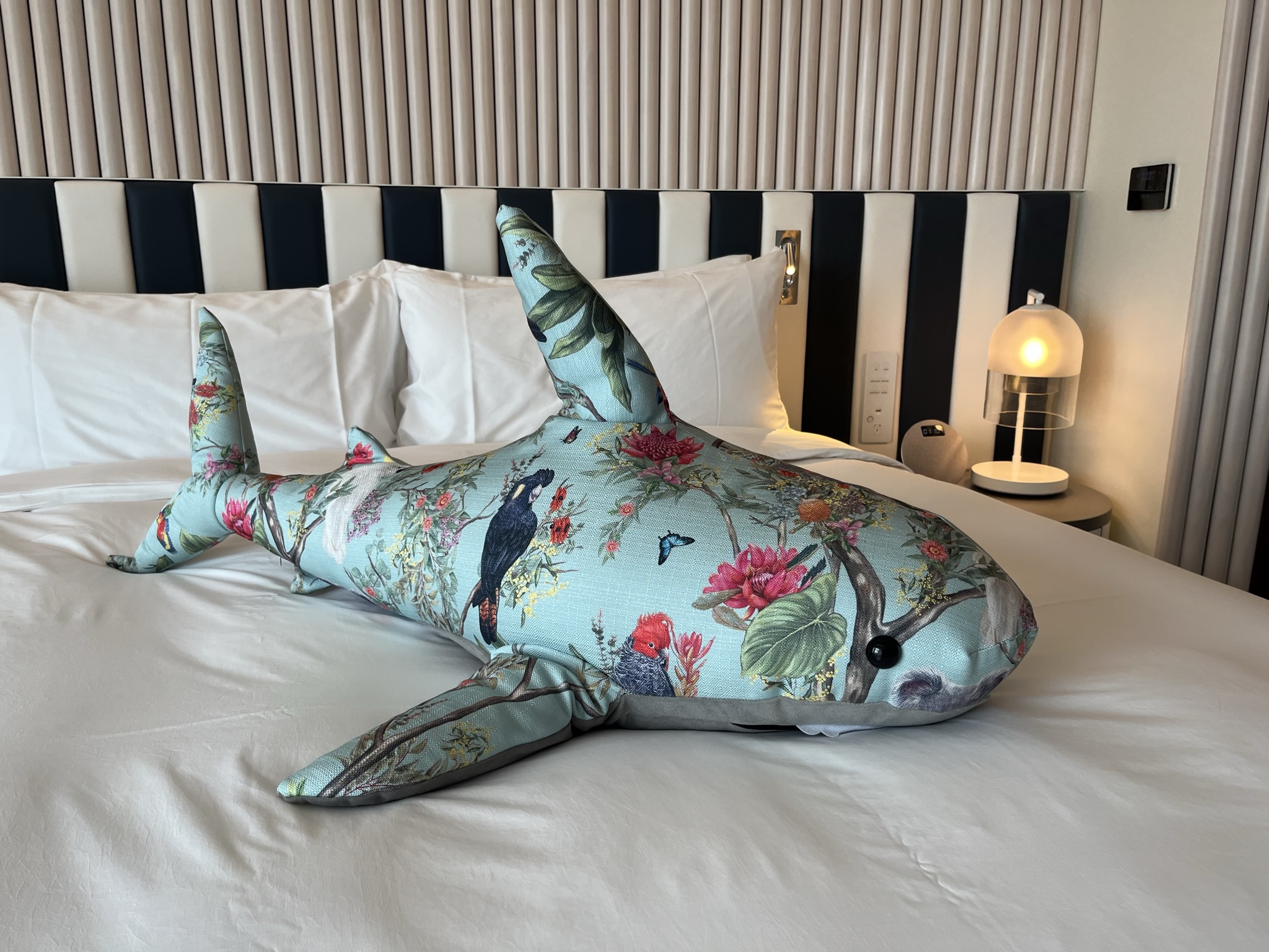 Eine detaillierte Beschreibung findet ihr hier auf der W Sydney Webseite. Wir hatten die günstigste Kategorie, einen Wonderful Room mit City View, gebucht und erhielten beim Check-In wie oben geschrieben ein Upgrade auf ein Spectacular Darling Harbour View Zimmer mit King Bed. Das Zimmer war mit 35 Quadratmetern recht geräumig und verfügte über einen Schlafbereich mit abgetrenntem Ankleidebereich sowie ein großes Badezimmer. Raumhohe Fenster boten einen tollen Blick auf den Darling Harbour. Auf dem Bett wartete ein großer Plüschhai, der für 300 AUD käuflich erworben werden konnte. Man merkte dem Zimmer an, dass das Hotel noch sehr neu ist. Alles war in einem einwandfreien Zustand und sehr gepflegt. Auch technisch war das Zimmer auf dem neusten Stand. Sämtliche Lampen bzw. Steckdosen ließen sich mit Touch-Schaltern bedienen. Auch die Gardinen konnten auf Knopfdruck zugezogen werden. Als etwas störend empfand ich, dass alle Schalter beleuchtet waren, was das komplette Abdunkeln des Zimmers verhinderte.