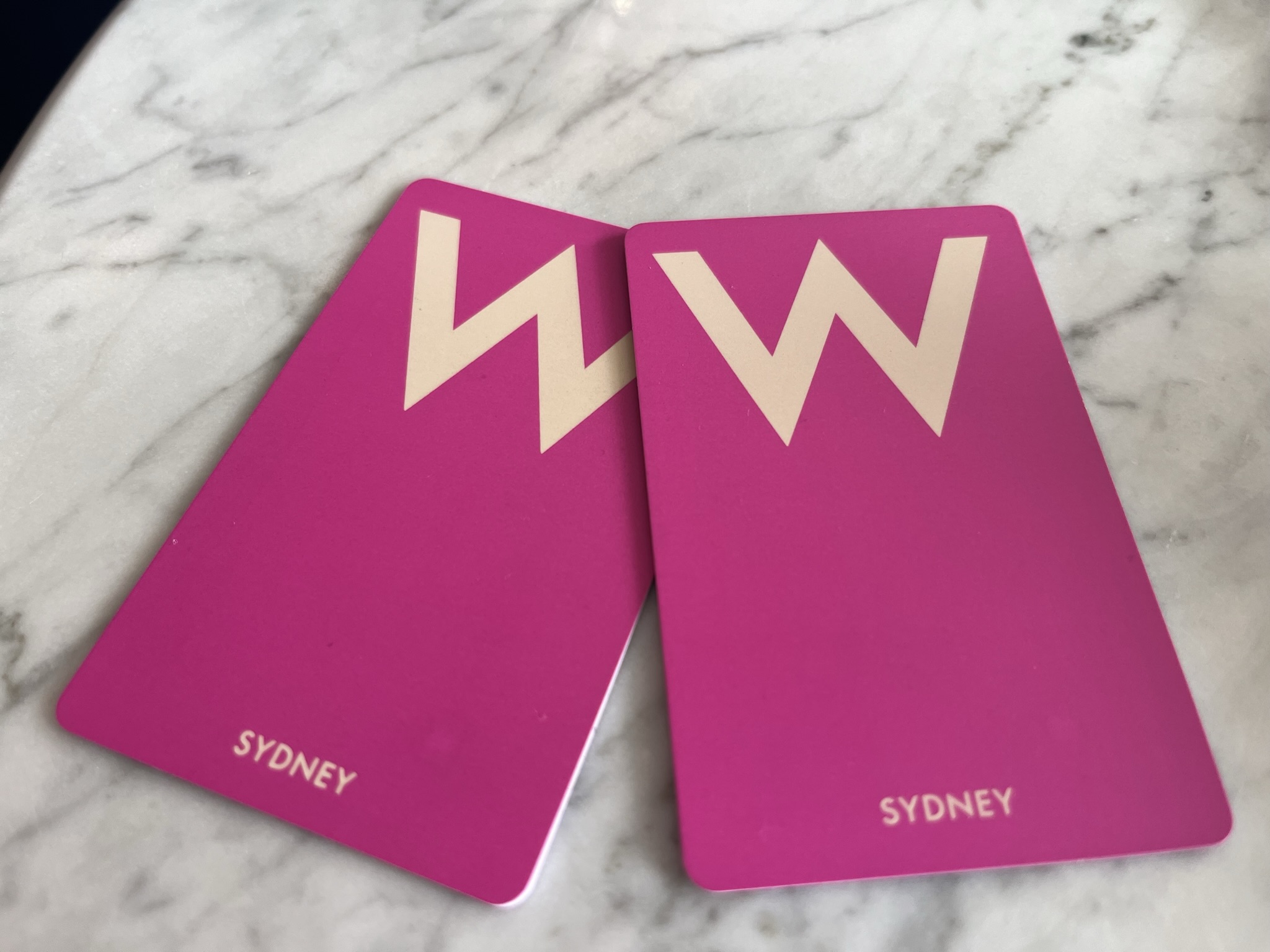 Wenige Minuten später erhielten wir unsere knallpinken Zimmerkarten und das Zimmer war fertig zum Bezug. Der Mitarbeiter hatte außerdem gute Neuigkeiten. Wir erhielten ein Upgrade auf ein Spectacular Zimmer mit Darling Harbour View. Auf Rückfrage erklärte uns der Mitarbeiter dann noch die restlichen Vorteile unserer Luminous-Buchung. So erfuhren wir, dass das 150 AUD Hotelguthaben mit allen Ausgaben im Hotel verrechnet werden könne – einzige Ausnahme sei die 2AM Dessert Bar. Ein Late Check-Out konnte uns zu diesem Zeitpunkt nicht zugesichert werden. Dieser sei aber wahrscheinlich auf Nachfrage am nächsten Morgen möglich. Schlussendlich sollte ein Wasserschaden auf einem anderen Level, der acht Zimmer betraf, dafür sorgen, dass wir um 12 Uhr auschecken mussten – immerhin eine Stunder später als der reguläre Check-Out.