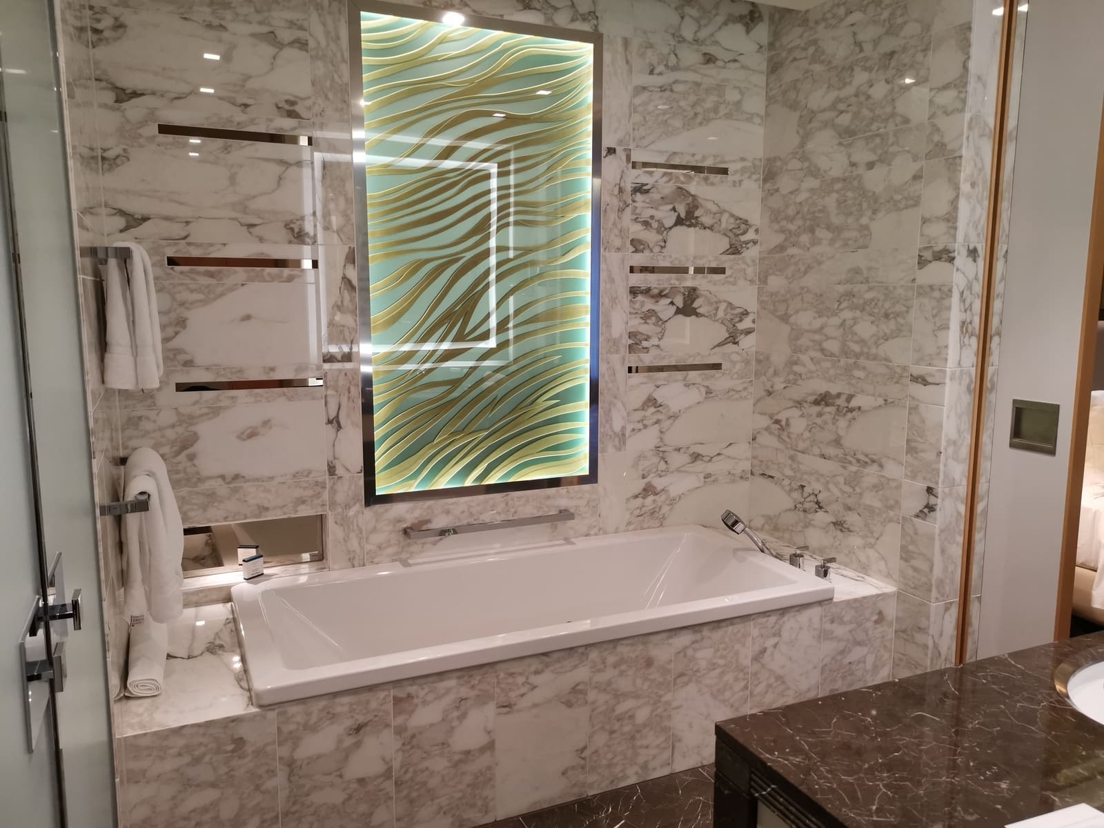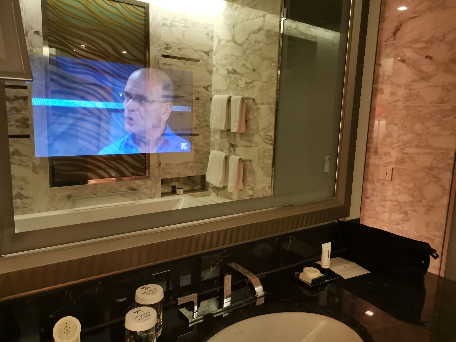 Das Badezimmer war sehr luxuriös und konnte, wie auch der Rest der Suite, dank zahlreicher Lampen individuell ausgeleuchtet werden. Neben einem großen Waschbecken und einer ebenso großen Badewanne gab es jeweils in separaten Räumen eine Dusche mit Regenduschkopf und beleuchteter Ablage sowie eine Toilette. Als besonderes Highlight empfanden wir den im Spiegel über dem Waschbecken eingebauten Fernseher, welcher klassisch über eine Fernbedienung bedient werden konnte. Der dazugehörige Lautsprecher befand sich in der Decke und ermöglichte so einen guten Sound. Das Bild war allerdings nur bei völliger Dunkelheit überzeugend. Duschgel und Shampoo standen in den umstrittenen Einwegflaschen zur freien Nutzung bereit.