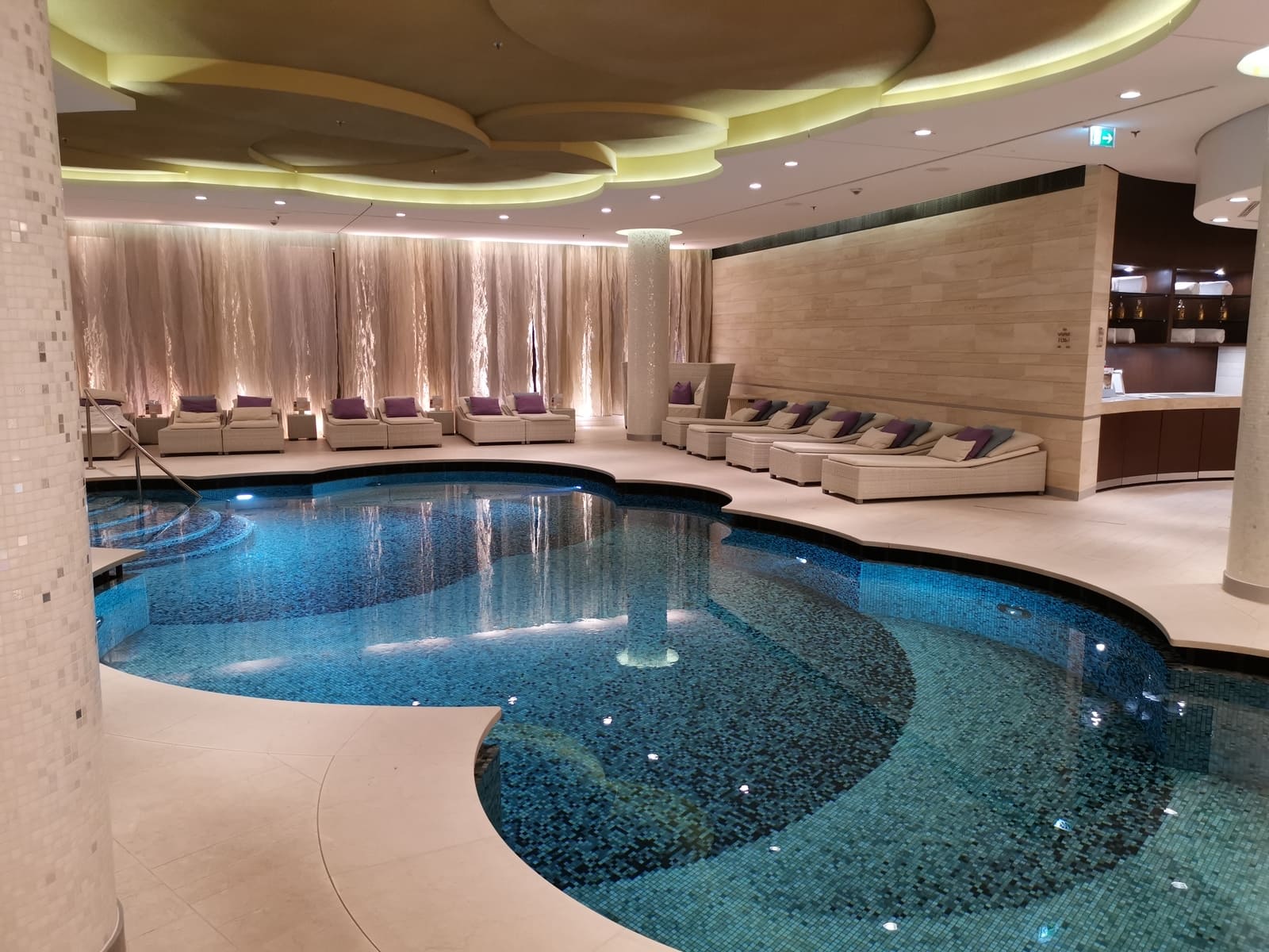 Der Pool- und Sauna-Bereich war nicht geschlechter-spezifisch getrennt und insgesamt sauber und einladend. Es wurde ein größeres Schwimmbecken, ein warmer Infinity-Whirlpool, sowie im leicht separierten Sauna-Bereich eine Dampf- (45 Grad) und eine Trockensauna (90 Grad) geboten. Zusätzlich wurden direkt im Sauna-Bereich zwei Regenduschen und nochmals frische Handtücher geboten. Zahlreiche Ruhemöglichkeiten boten die Liegen rund um den Pool, die auf ein kleines Nickerchen einluden. Frisches, mit Früchten versetztes Wasser und Obst wurde auch geboten.