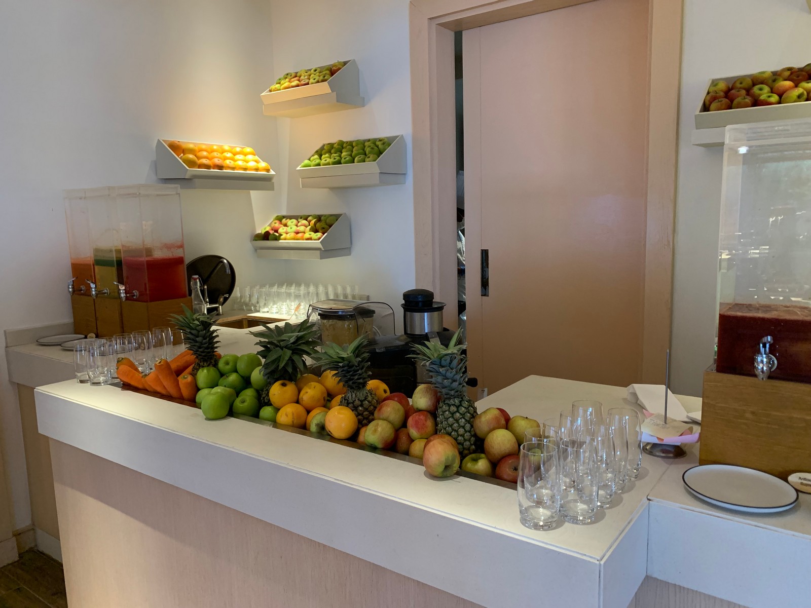 Gleichzeitig hatte das Tasting Table Restaurant die schönste Atmosphäre. Jeden Morgen wurden wir von einem freundlichen Mitarbeiter oder Mitarbeiterin begrüßt und zu einem Tisch auf der dem Meer zugewandten Terrasse oder Strand geführt. Mit den Füßen im Sand und Blick auf das Meer und den Sonnenaufgang ließ es sich hier sehr gut aushalten. Neben Tischen im Sand gab es zudem Sitzplätze auf der Terrasse oder im Innenbereich. Morgens um 8 ging es hier sehr entspannt zu, gegen 9 wurde es dann etwas voller, aber zu keiner Zeit hektisch – trotz fast maximaler Auslastung des Resorts. Kaffee, Tee und frische Säfte wurden uns vom freundlichen Personal an den Tisch gebracht.