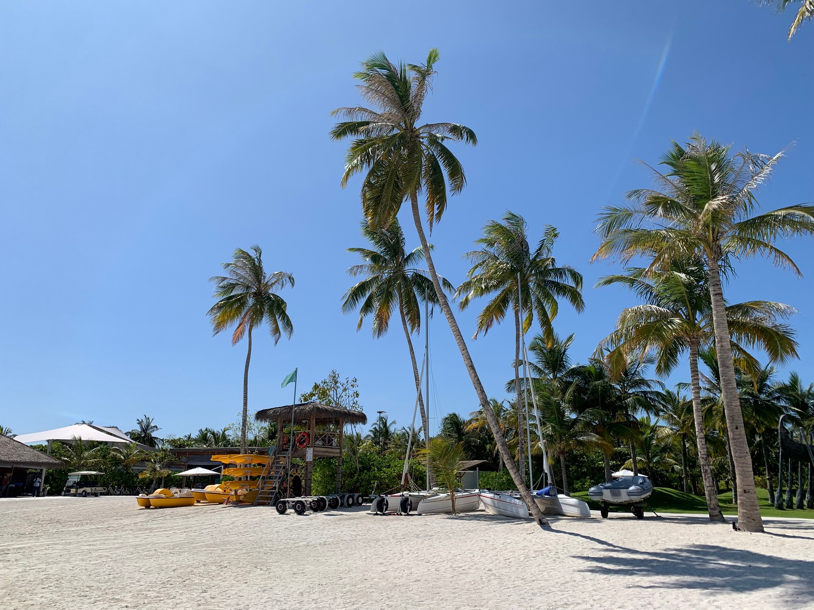 Doch wer braucht schon einen Pool, wenn man einen absoluten Traumstrand direkt vor der Tür hat? Ebenfalls an der breitesten Stelle der Insel gelegen und den Pools vorgelagert, ist ein langer weißer Sandstrand wie aus dem Bilderbuch. Am Hauptstrand ist auch das Wassersport-Center zu finden. Equipment ohne Motor, wie beispielsweise Kayaks, kann kostenlos genutzt werden. Motorisierte Aktivitäten, wie Parasailing, Underwater Scooter, Jetskis, Jetpacks oder aber auch verschiedenen Kurse können gegen Gebühr gebucht werden. Eine Übersicht der buchbaren Aktivitäten findet ihr hier auf der Hilton Webseite.