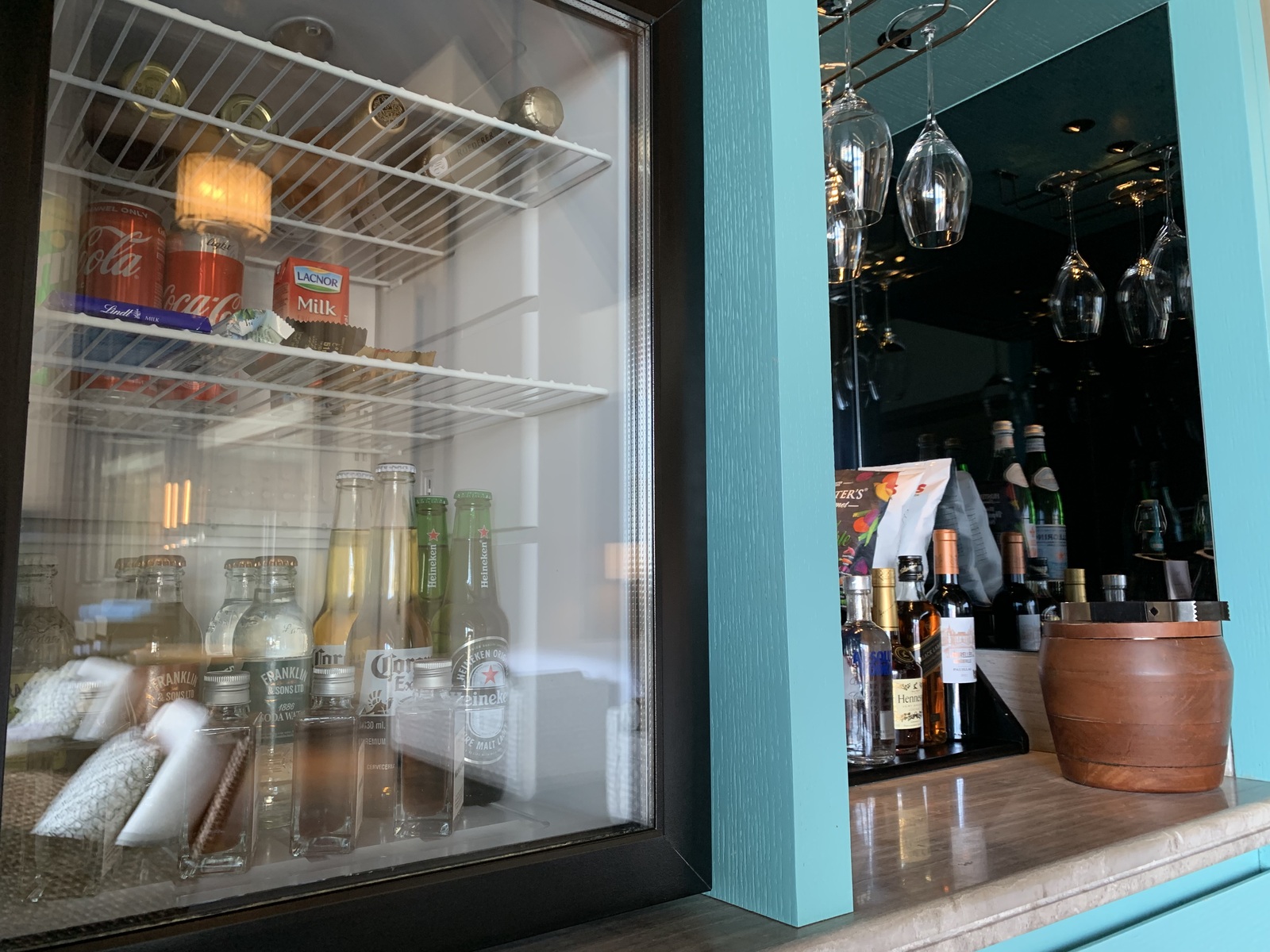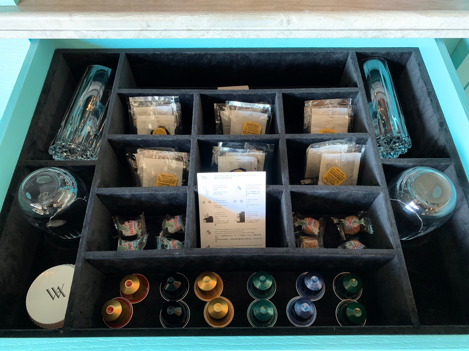 Unser Zimmer verfügte über Minibar mit diversen alkoholischen und nicht-alkoholischen Getränken sowie einigen Snacks. Zusätzlich gab es zwei große Wasserflaschen aus Glas, die täglich aufgefüllt bzw. ausgetauscht wurden. Eine kleine Kaffeemaschine stand ebenso zur Verfügung.