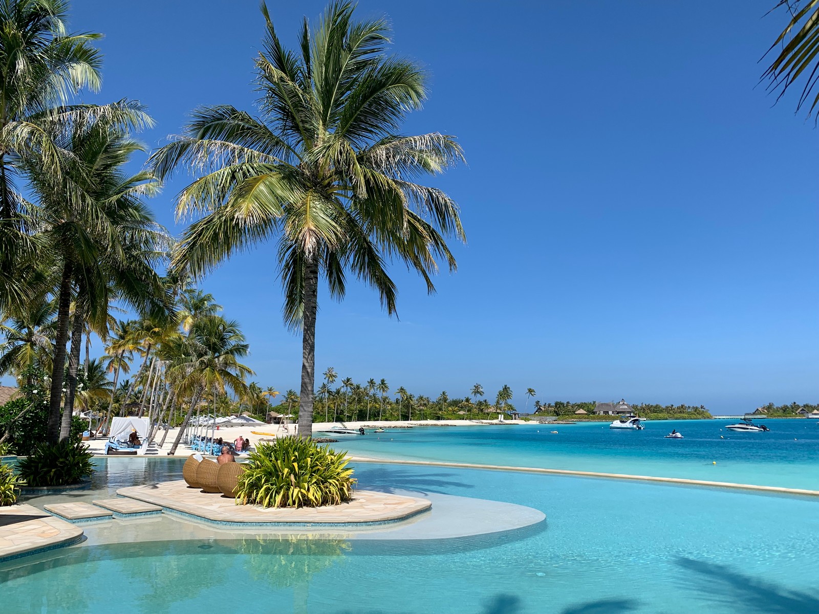 Das Waldorf Astoria Maldives Ithaafushi verfügt zwei große Gemeinschaftspools, den sog. Lagoon und den Mirror Pool, die sich im zentralen Bereich des Resorts befinden. Auf Sonnenliegen und Cabanas lässt es sich hier unter Palmen entspannen. Der Pool war soweit wir es mitbekommen haben meist nur spärlich besucht – nicht weiter überraschend, steht doch jedem Gast auf der Insel ein eigener Pool zur Verfügung. In unmittelbarer Nähe des Lagoon Pools lagen mit Nava und The Ledge zwei der insgesamt 11 Restaurants.