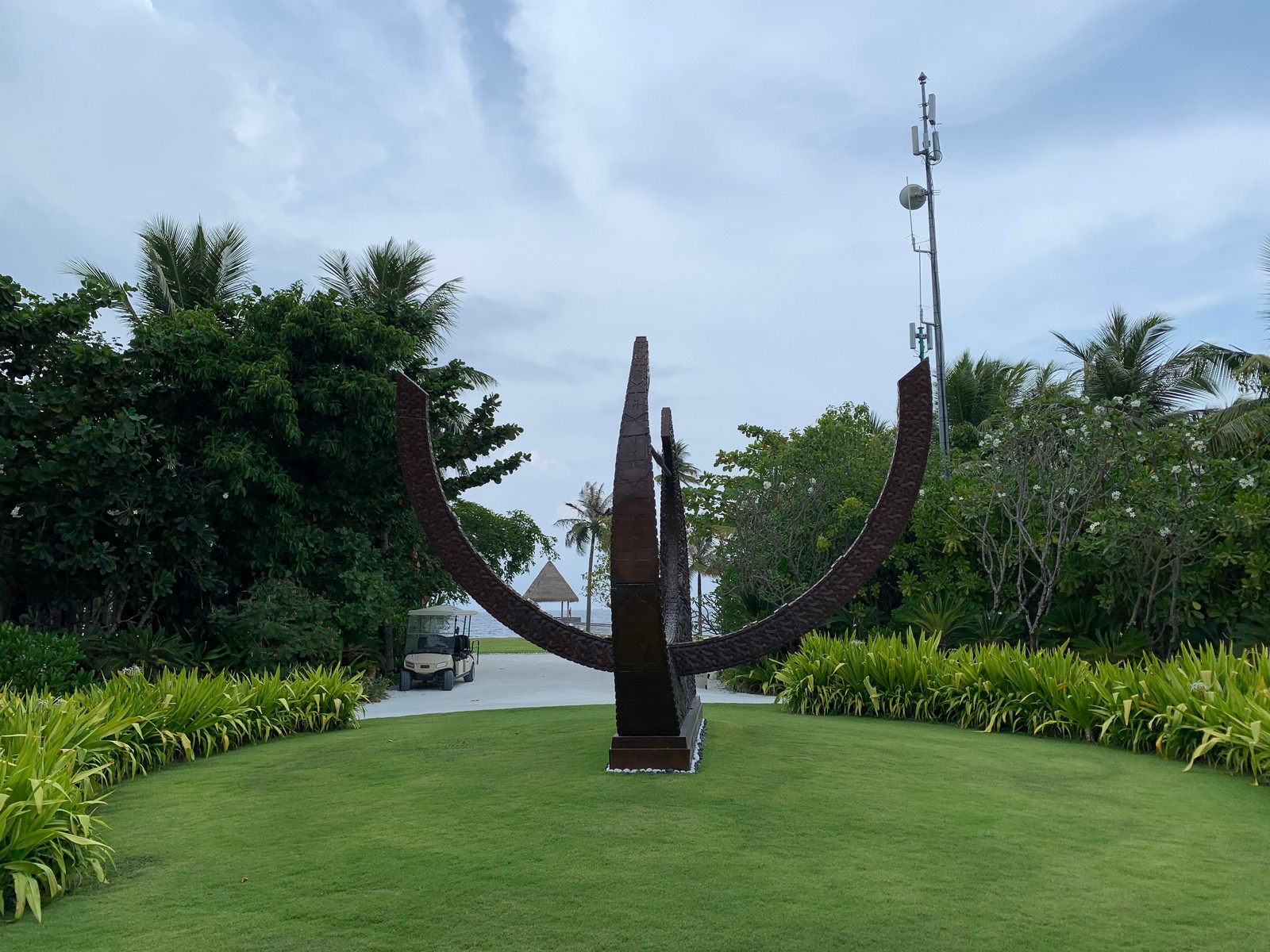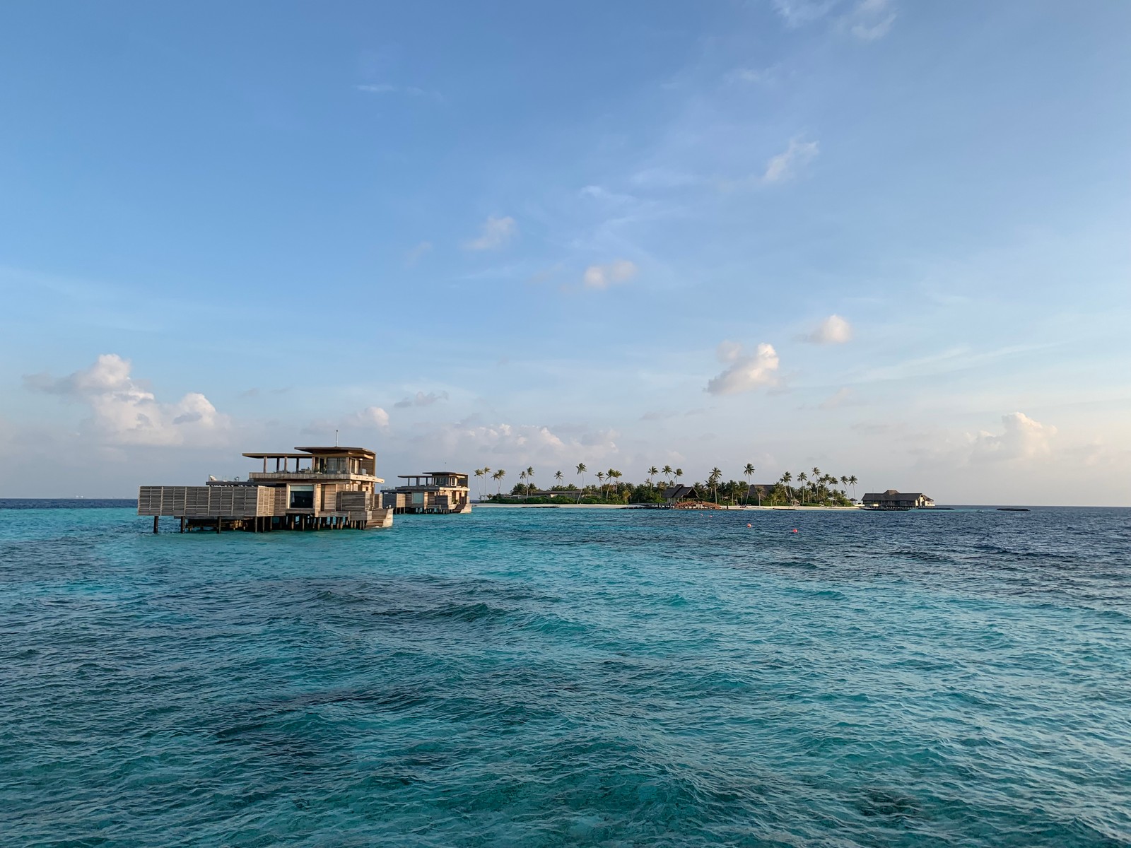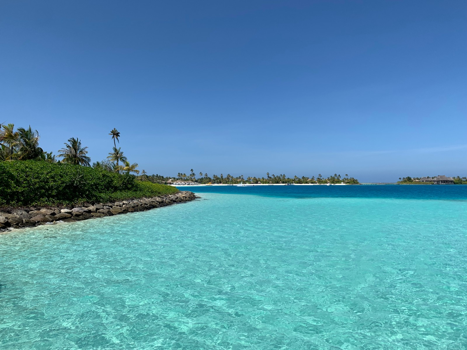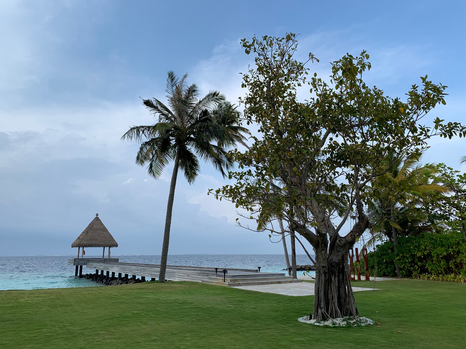 Wenig später saßen wir einem der zahlreichen Golfbuggies und erhielten eine kurze Inseltour bevor es zu unserer Villa gehen sollte. Wie bereits oben erwähnt, ist das gesamte Resort ca. 3,5 Kilometer lang, sodass zum Teil lange Wege zurückgelegt werden müssen. Dabei dient eine mit einer dünnen Sandschicht bedeckte Betonstraße als zentrale Lebensader des Resorts. Gezeigt wurden uns die 11 Restaurants und Bars auf der Insel, die beiden Gemeinschafts-Pools, das Fitnessstudio und Spa, der Tennisplatz, der Kids Club sowie Hauptstrand samt Sport Equipment. Mehr zu den einzelnen Einrichtungen später. Stattdessen folgend ein paar der großartigen Blicke, die sich von überall im Resort ergeben.