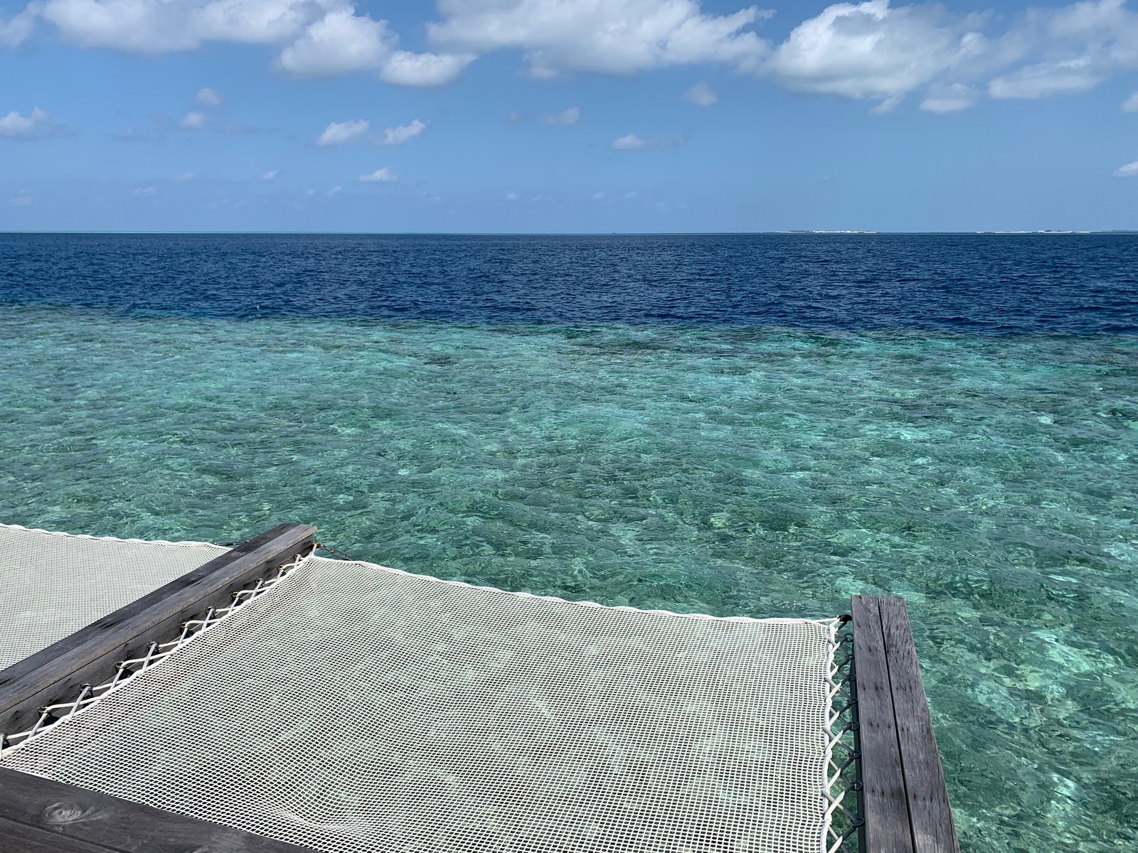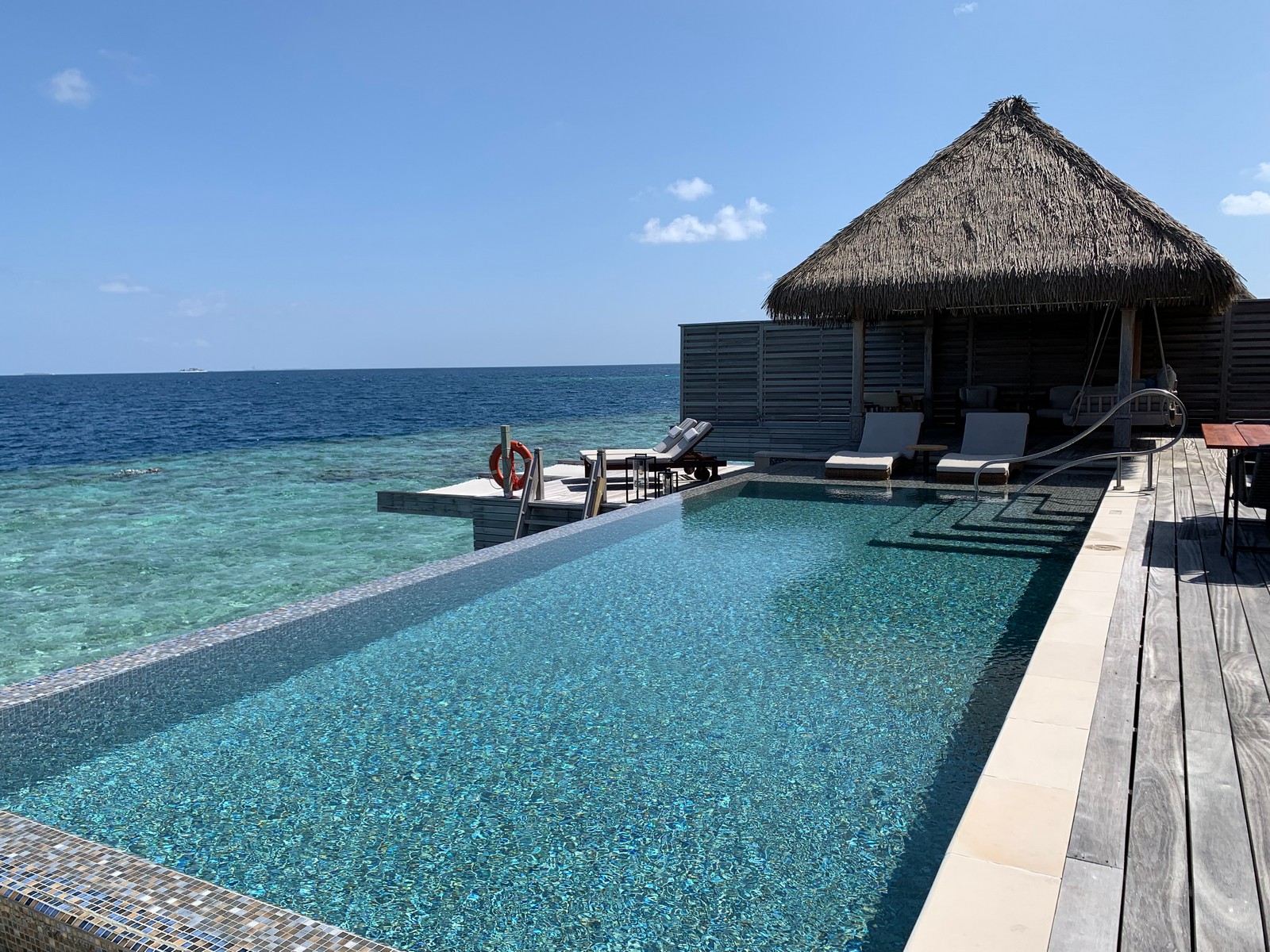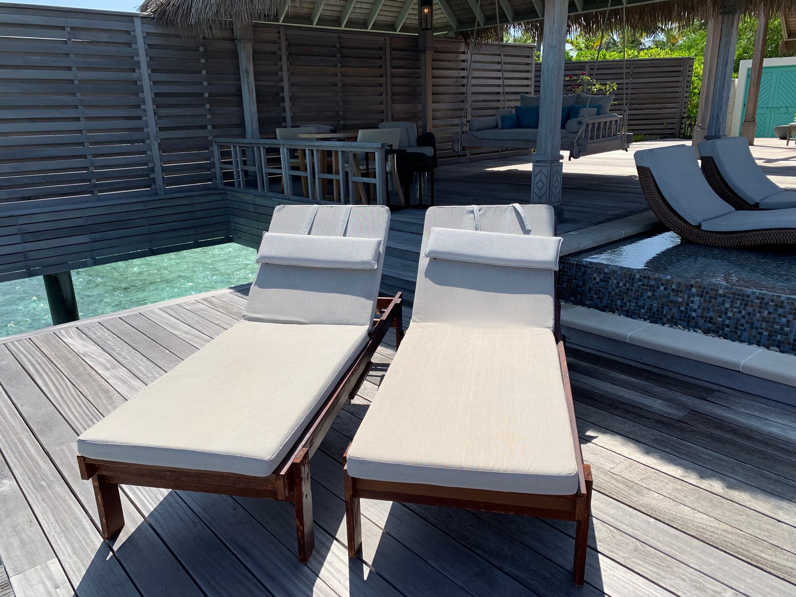 Highlight der Villa war für mich klar das große Deck mit eigenem Infinity Pool (Süßwasser). Hier konnte man es entspannt den ganzen Tag aushalten. Im Pool ließ es sich jederzeit abkühlen und dank eigenem Zugang zum Meer bzw. Riff war die faszienierende Unterwasserwelt der Malediven jederzeit nur ein paar Flossenschläge entfernt. Dank insgesamt gleich sechs gepolsterten Liegen konnte man sich zu jeder Tageszeit den passenden Sonnen- oder Schattenplatz aussuchen. Weiterhin gab es am Ende der Terrasse ein über Meer aufgespanntes Netz.