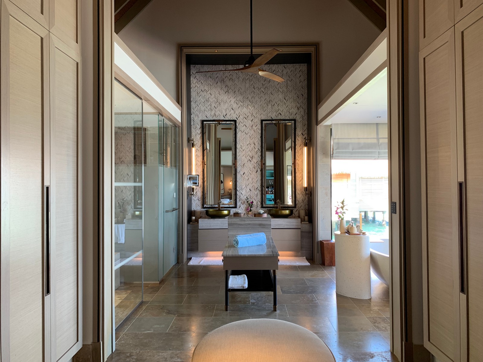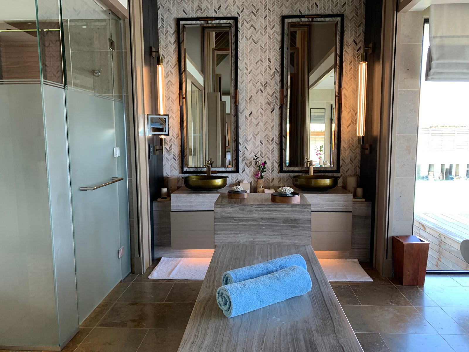 Wohn und Schlafbereich nahmen ungefähr zwei Drittel der Villa ein, doch auch das Bad bot noch jede Menge Platz. Neben einer großen Badewanne mit Meerblick durften wir uns über zwei Duschen (drinnen und draußen) freuen. Der Außenbereich des Bades war von einer hohen Mauer umgeben und ermöglichte das Duschen unter Palmen. Die zur Verfügung stehenden Amenities kamen von Salvatore Ferragamo – Tuscan Soul.