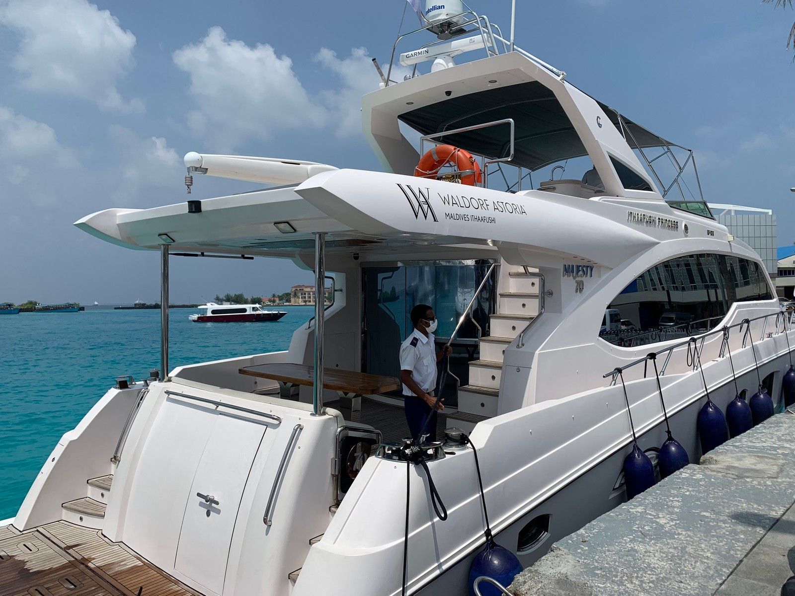 Laut Crew gibt es gleich sieben Waldorf Astoria eigene Yachten, die Gäste zwischen dem Resort und Malé befördern. Da das Waldorf vergleichsweise nah an Malé liegt ist ein Transfer mit der Yacht die schnellste Option. Ein Flug mit dem Wasserflugzeug wäre zwar – sobald in der Luft – deutlich schneller, allerdings wäre zuvor ein etwas längerer Weg zum Anleger der Wasserflugzeuge notwendig. Die Yacht ist da die deutlich unkompliziertere und angenehmere Variante.
