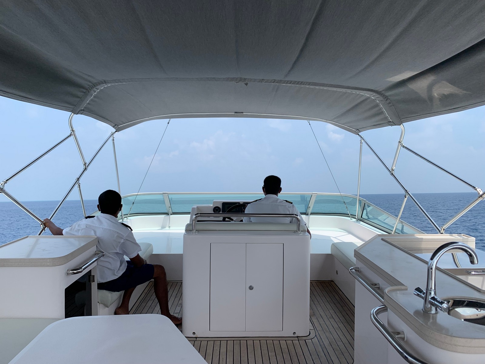 Während der ca. 40-minütigen Fahrt machten wir es uns bei bestem Wetter auf dem Oberdeck bequem und genossen den Ausblick auf Malé, das Meer und die zahlreichen Resorts. Alternativ können Passagiere die Überfahrt nutzen und sich in einem der Schlafzimmer samt WC einrichten. Bei unseren beiden Überfahrten wurde diese jedoch nur als Umkleidekabinen genutzt. Das Bestellen von Champagner stellte sich als der beliebteste Zeitvertreib heraus.
