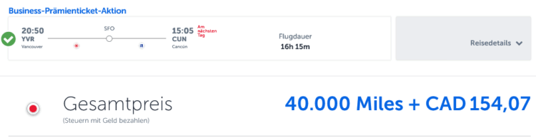 Wie eben schon beschrieben, sind Flüge innerhalb der USA ein Sonderfall für Flüge innerhalb der Nordamerika-Zone, die neben den USA (inklusive Hawaii) auch noch Mexiko, Kanada, Bermuda und die Niederländischen Antillen umfasst. Grenzüberschreitende Flüge innerhalb dieser Zone kosten 30.000 bzw. 40.000 Meilen in der Economy Class bzw. Business Class. Fliegt zum Beispiel für 40.000 Meilen und etwa 96 Euro Steuern und Gebühren in der Air Canada und United Business Class von Vancouver über San Francisco nach Cancun.