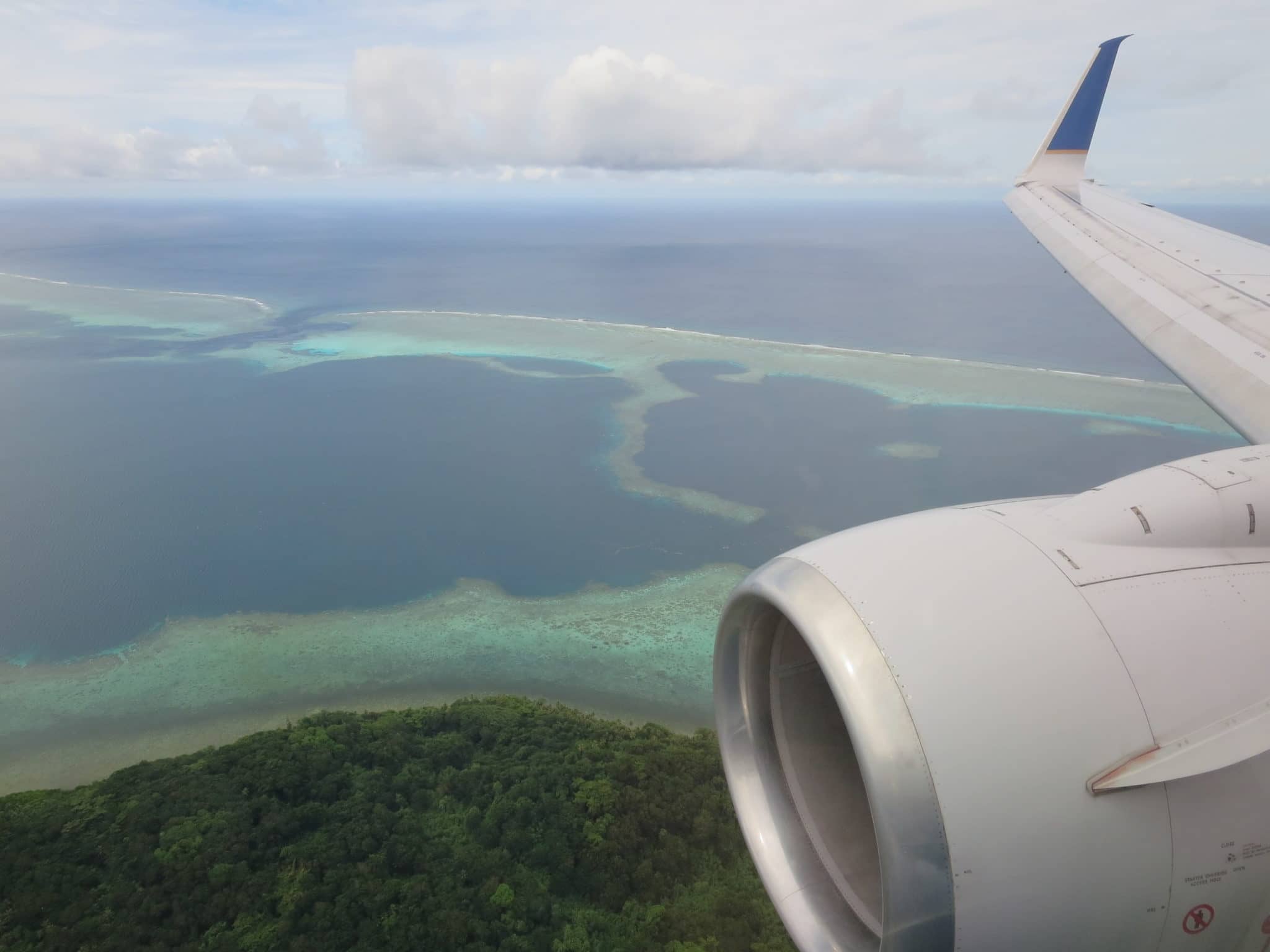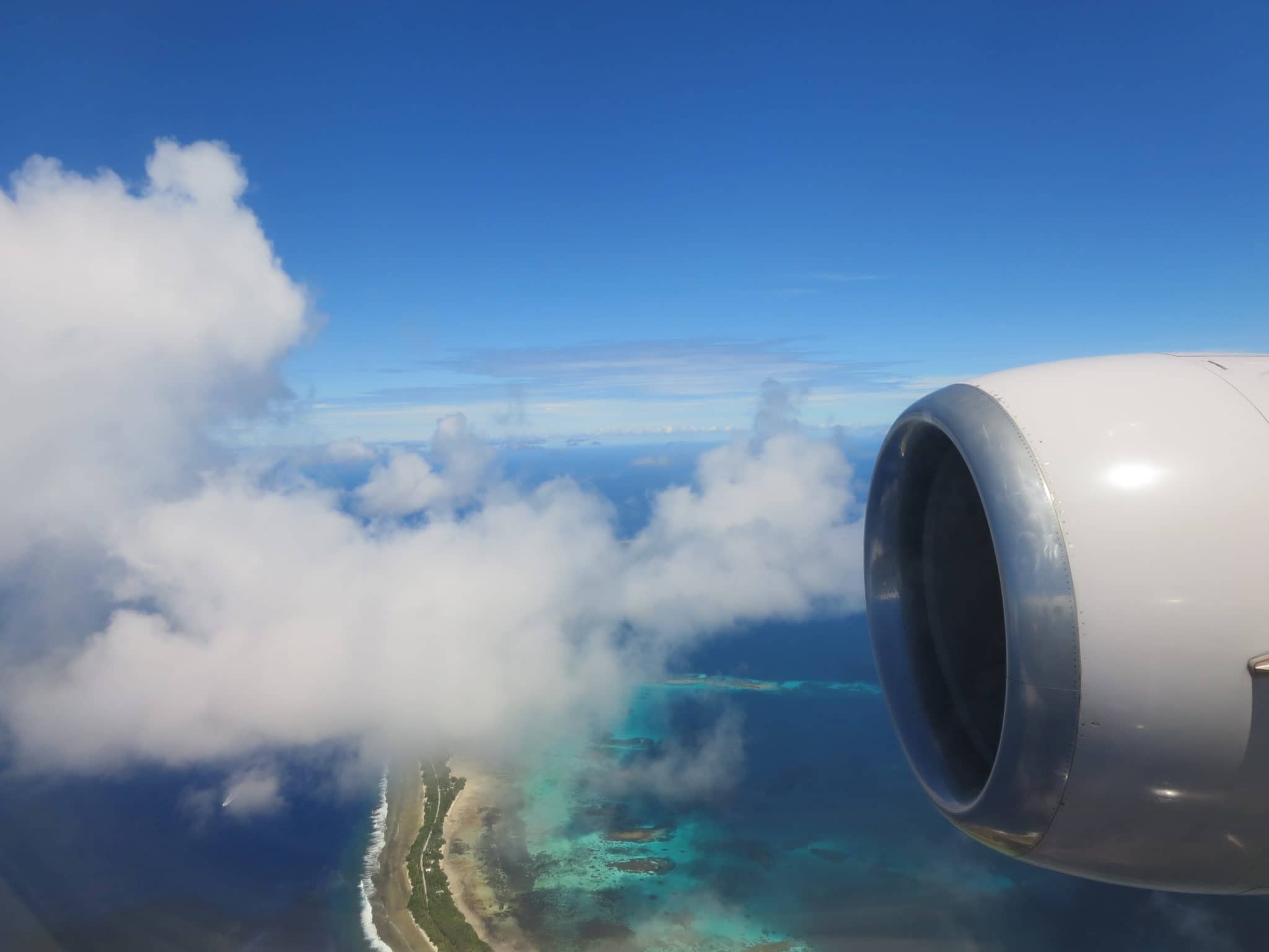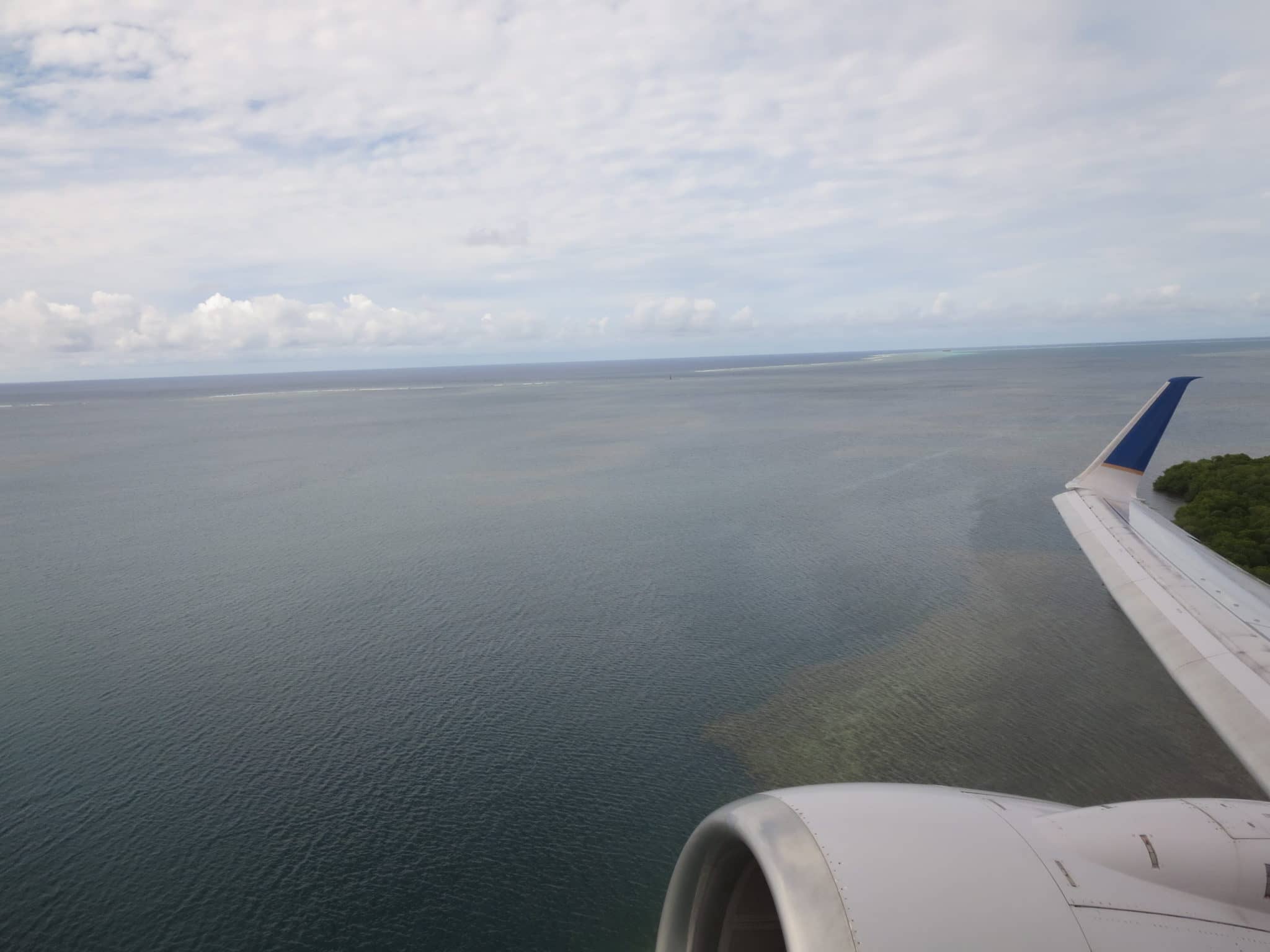 Nach wenigen Minuten Flug war Hawaii außer Sichtweite und es folgten mehrere Stunden Flug über den offenen Pazifik. Das Wetter war zu diesem Zeitpunkt hervorragend – tiefblaues Meer und strahlend blauer Himmel. Die Crew nutze die Chance die einzige echte Mahlzeit auf dem langen Flug zu servieren. Der Landeanflug auf das Majuro-Atoll, die Hauptstadt der Marshallinseln, war dann das nächste Highlight des Island Hoppers. Bei strahlendem Sonnenschein ergab sich ein toller Blick auf die winzigen im Pazifik verstreuten Atollinseln. Spektakulär ist auch die nur 2.407 Meter lange Landebahn welche einen Abschnitt des ringförmigen Riffs komplett für sich beansprucht. Nur wenige Meter links und rechts der Landebahn befindet sich das Meer.