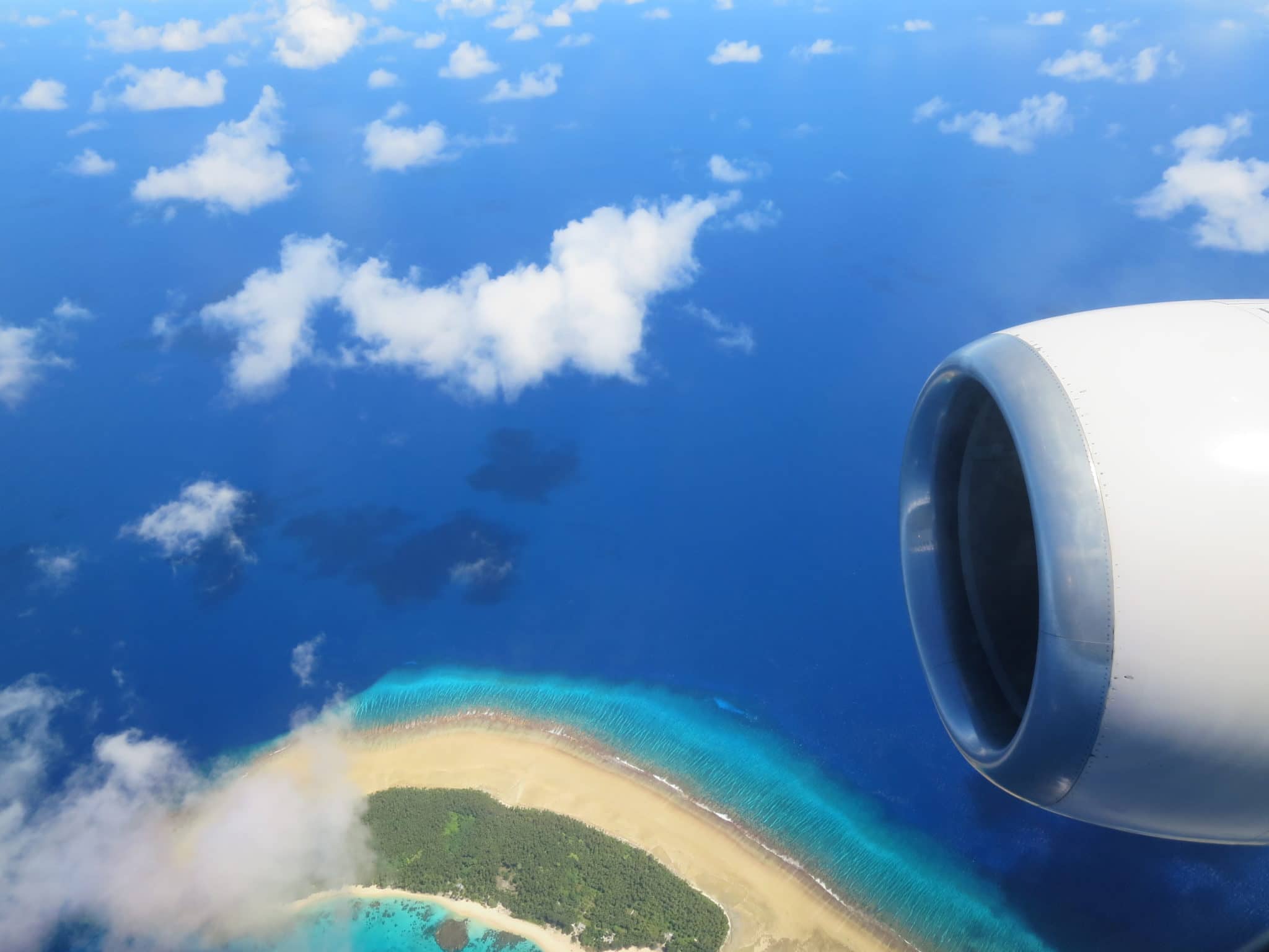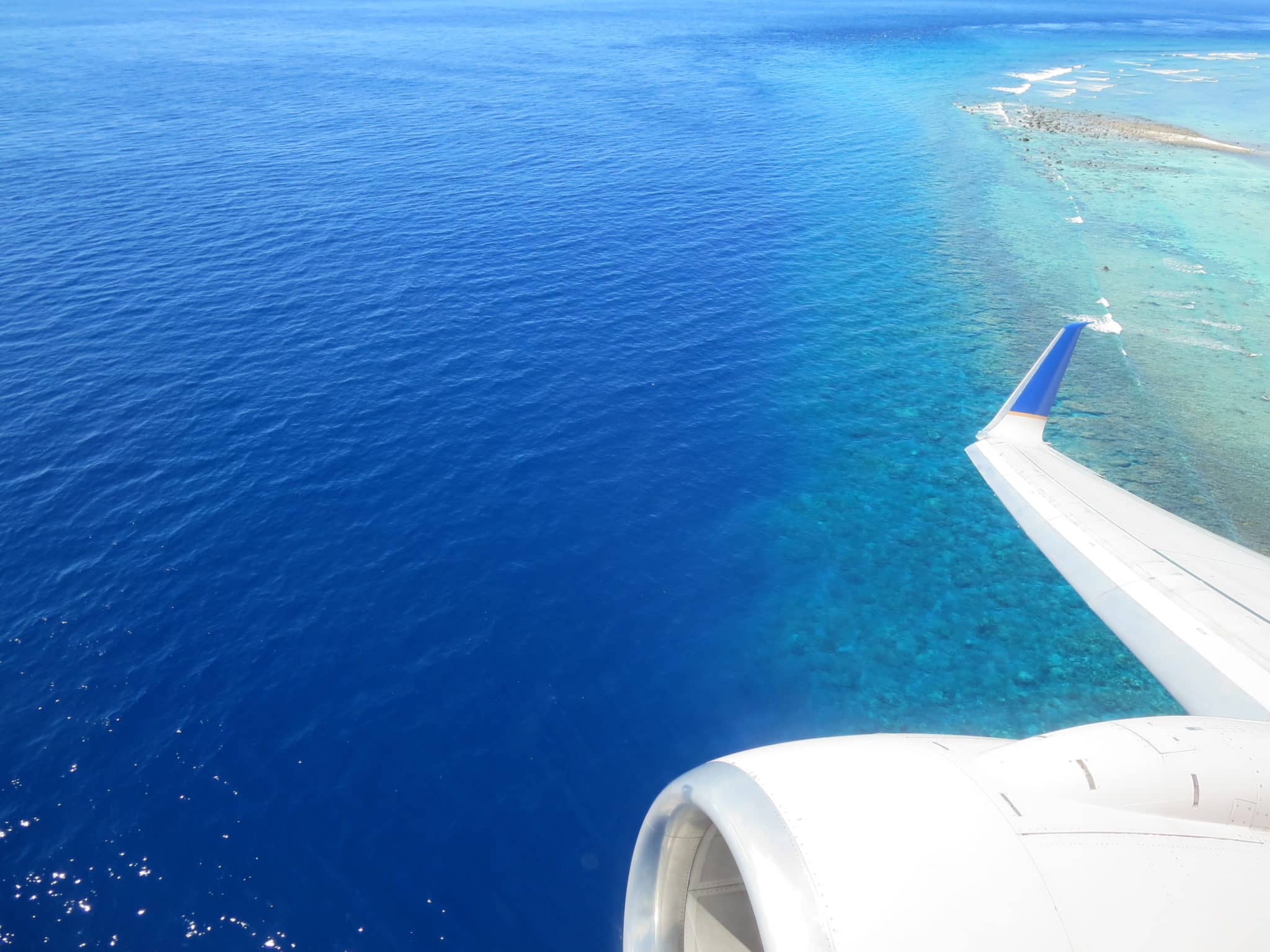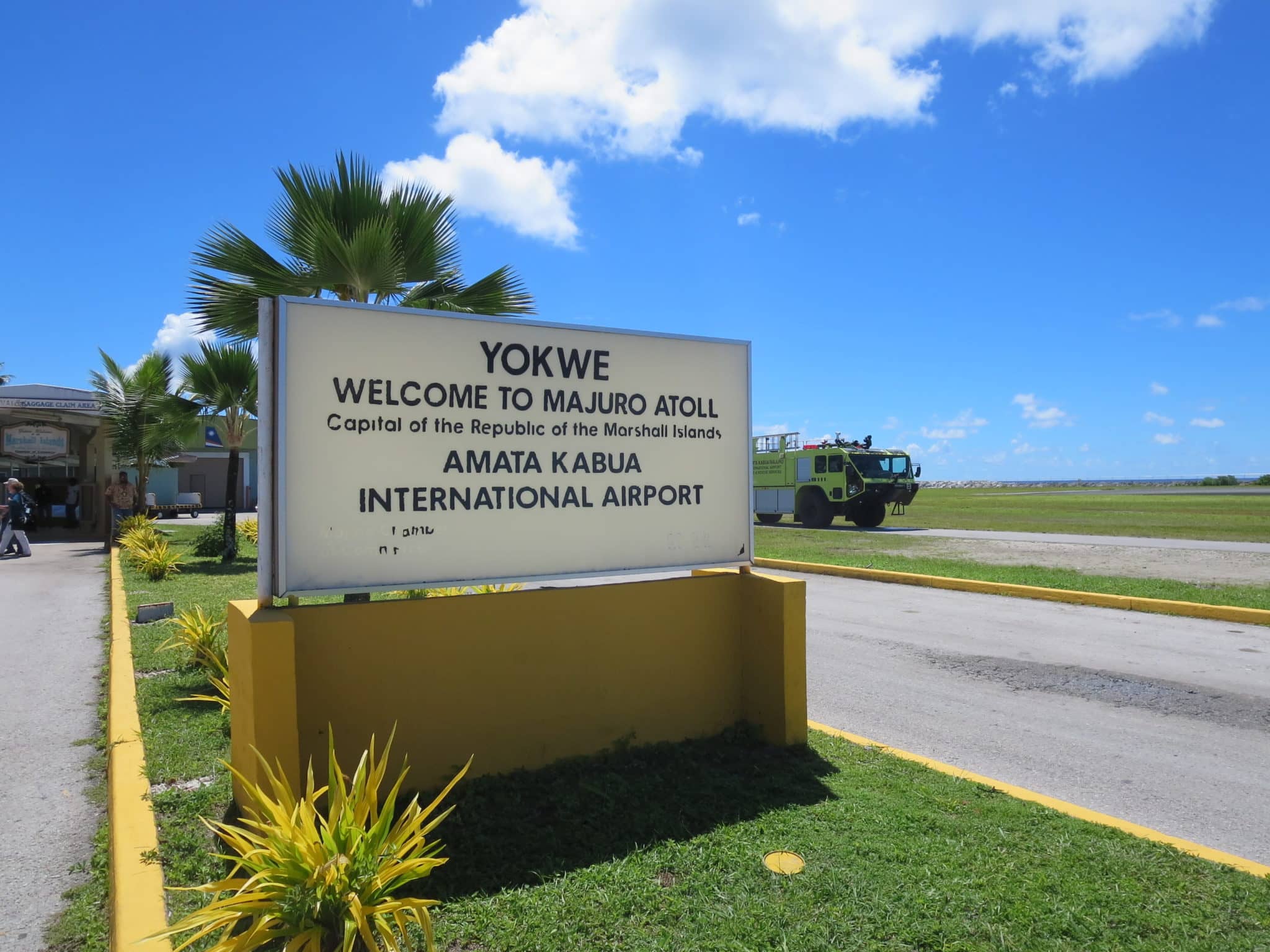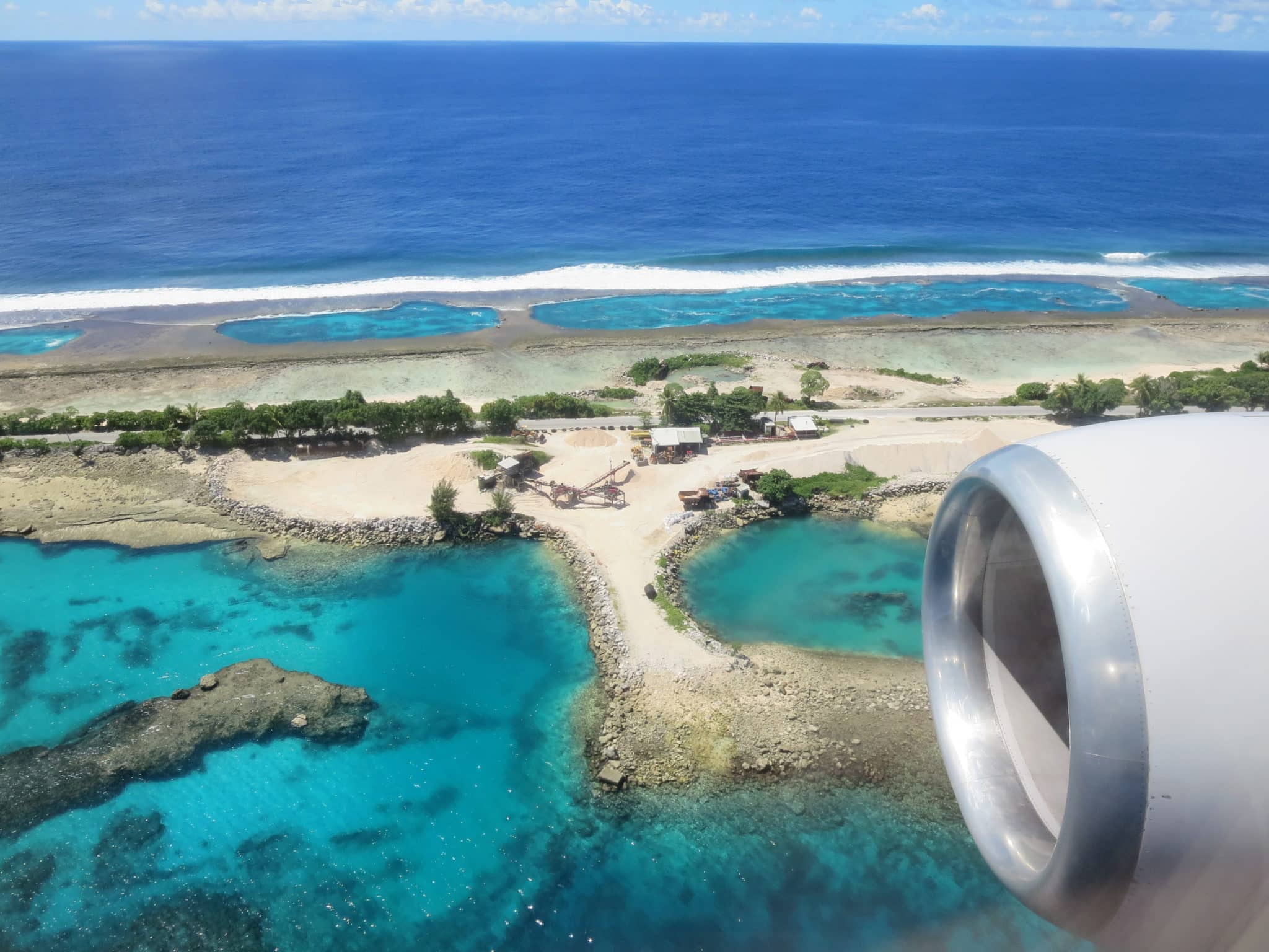 Nach wenigen Minuten Flug war Hawaii außer Sichtweite und es folgten mehrere Stunden Flug über den offenen Pazifik. Das Wetter war zu diesem Zeitpunkt hervorragend – tiefblaues Meer und strahlend blauer Himmel. Die Crew nutze die Chance die einzige echte Mahlzeit auf dem langen Flug zu servieren. Der Landeanflug auf das Majuro-Atoll, die Hauptstadt der Marshallinseln, war dann das nächste Highlight des Island Hoppers. Bei strahlendem Sonnenschein ergab sich ein toller Blick auf die winzigen im Pazifik verstreuten Atollinseln. Spektakulär ist auch die nur 2.407 Meter lange Landebahn welche einen Abschnitt des ringförmigen Riffs komplett für sich beansprucht. Nur wenige Meter links und rechts der Landebahn befindet sich das Meer.