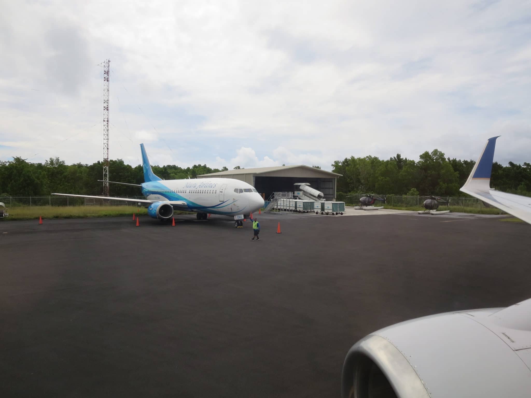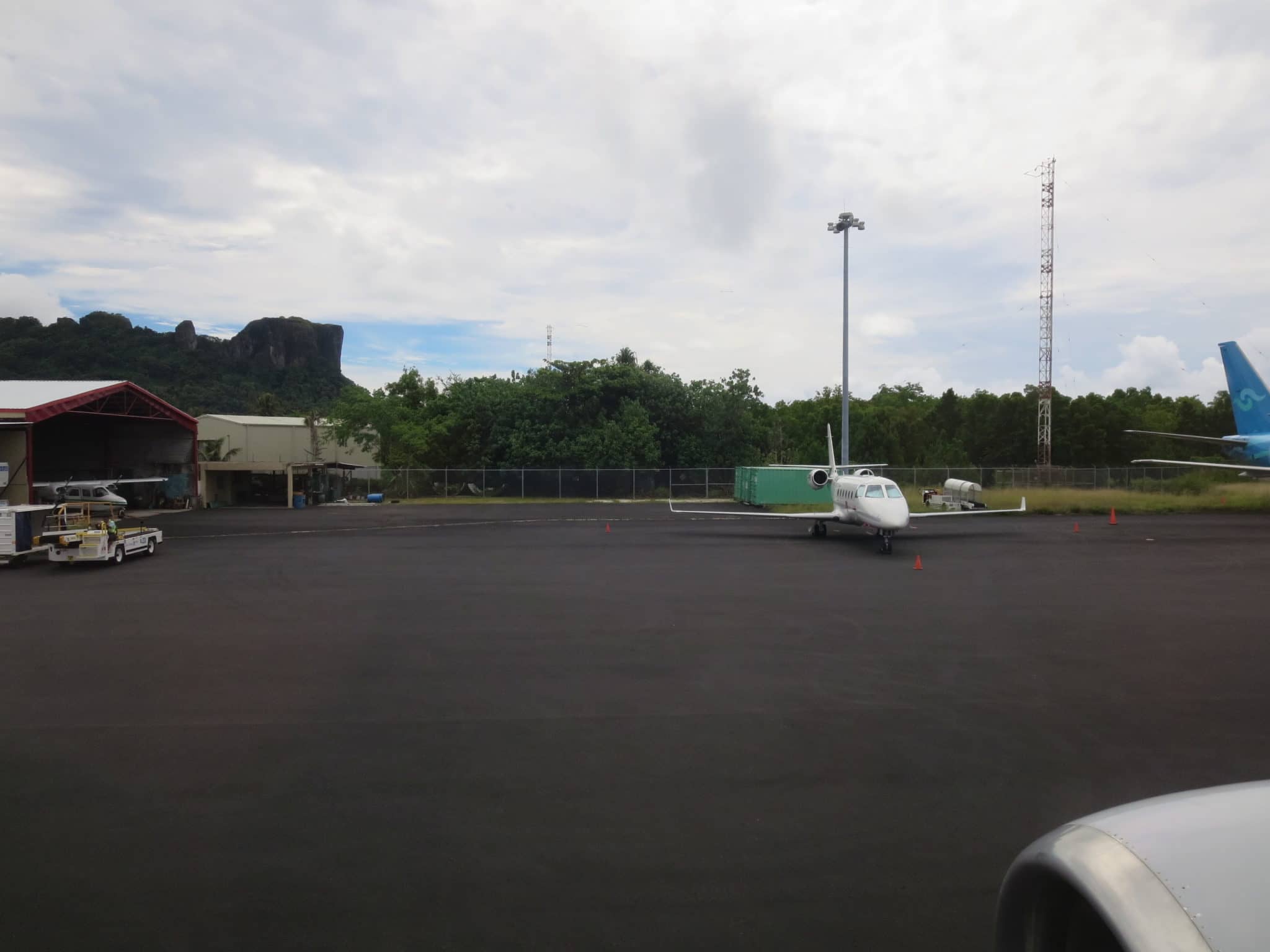 Am Boden erwartete uns wieder ein kleines Terminal. Auch ein gab es etwas mehr anderes Fluggerät zu sehen. Eine Maschine der Nauru Airlines, zwei Helikopter und ein Privatjet standen auf dem Flughafen. Hinter den Gebäuden des Flughafens erhebt sich eine beeindruckende Bergkette.