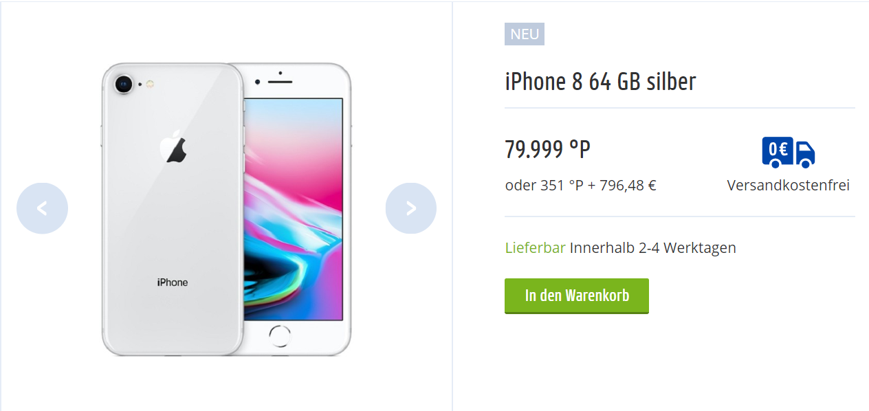 Im Prämienshop verlangt Payback 79.999 Payback Punkte für das iPhone 8 64GB in Silber. Bei dem von Payback festgelegten Wert von 1 Cent pro Punkt, ist das ein umgerechneter Preis von 799,99€. Im Apple Store wird das gleiche iPhone 8 64GB in Silber für 679,00€ und bei Amazon sogar für 619,90€ angeboten. Das macht einen Preisunterschied von knapp 121€ bzw. 180€. Damit reduziert sich der Gegenwert eines Payback Punktes auf 0,85 Cent bzw. 0,77 Cent pro Payback Punkt. Schon nach kurzer Recherche wird offensichtlich, wir machen hier ein schlechtes Geschäft. Der grundlegende Wert wurde zwar auf 1 Cent pro Punkt festgelegt, doch durch die Betrachtung anderer Märkte und Angebote, sinkt der relative Wert eines Punktes in diesem Beispiel unter einen 1 Cent.
